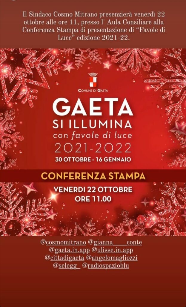 “Si riparte con rinnovato entusiasmo ed una grandissima emozione”.Così il Sindaco di Gaeta Cosmo Mitrano nel corso della presentazione dell’atteso evento “Favole di Luce” che si svolgerà a Gaeta dal 30 ottobre al 16 gennaio 2022.