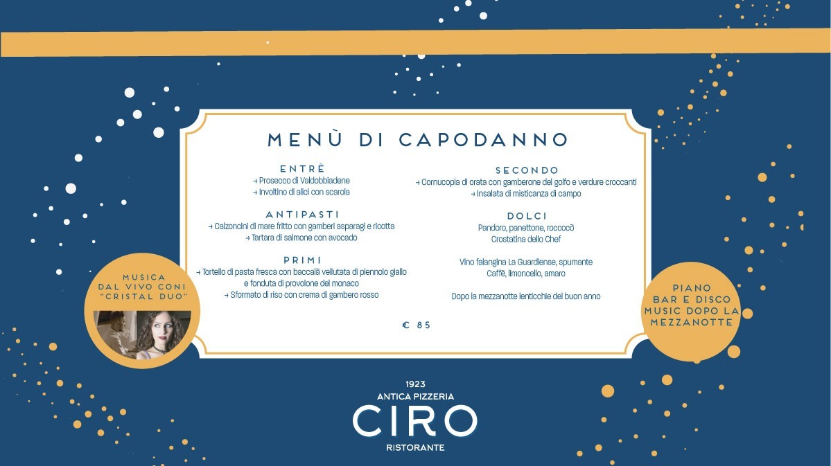 Cenone di Capodanno a Gaeta? Antica Pizzeria Ciro è la risposta. L’Antica Pizzeria Ciro propone un menù di capodanno adatto a chi vuole concedersi il piacere della buona tavola abbinato all’innovazione culinaria. Il veglione di San Silvestro a Gaeta può concludersi in armonia nella rinomata location di mare, coccolati dalla magica atmosfera delle luminarie di Gaeta. Attento alla normativa vigente, Giorgio Moffa, titolare e radicato ristoratore formato a Napoli ha esportato la sua esperienza qui a Formia con Nodi e a Gaeta con “Antica Pizzeria Ciro”, preparando per ambedue i ristoranti un menù di Capodanno tutto da assaporare.