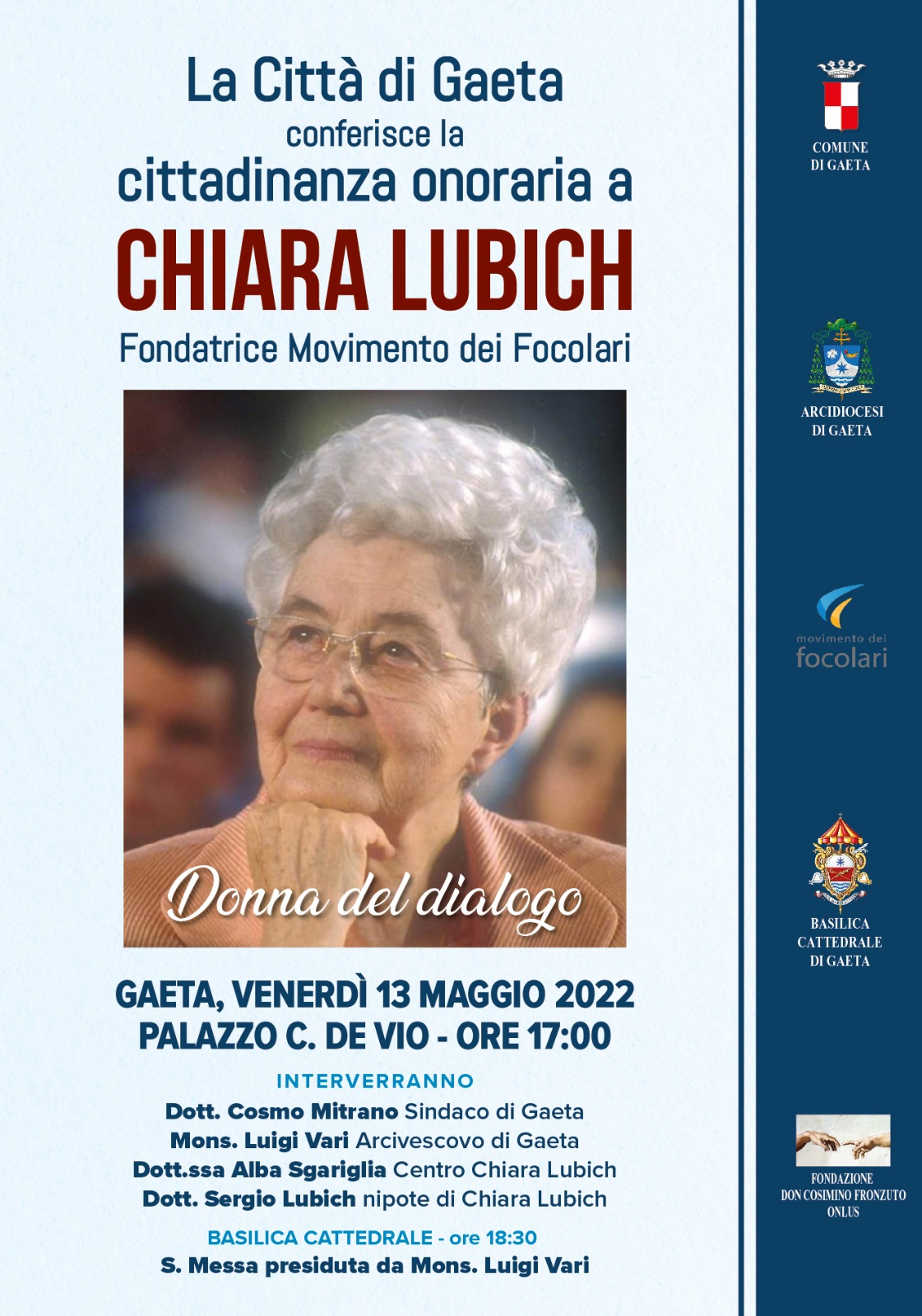 Gaeta, cittadinanza onoraria a Chiara Lubich – Venerdì 13 maggio alle 17.00 presso il Palazzo Cardinal De Vio di Gaeta sarà conferita la cittadinanza onoraria postuma alla fondatrice del Movimento dei Focolari: Chiara Lubich. All’unanimità il Consiglio Comunale aveva già deliberato questo conferimento “per aver aperto una cultura dell’unità, adatta alla società multietnica, multiculturale e multireligiosa” e per “l’amore verso la città di Gaeta”. Infatti, secondo la delibera, Chiara “ha manifestato più volte questo amore attraverso i suoi discorsi e i suoi messaggi indirizzati agli aderenti del Movimento” in Gaeta, che svolgevano “attività e iniziative finalizzate alla realizzazione dell’ultima preghiera di Gesù: «Che tutti siano uno»”.