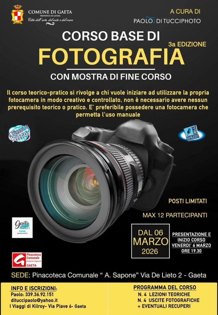 GAETA – Prenderà il via il prossimo 6 marzo 2026 la terza edizione del Corso Base di Fotografia, promosso dal Comune di Gaeta e curato dal fotografo Paolo Di Tucci. L’iniziativa, a carattere teorico-pratico, è rivolta a tutti coloro che desiderano avvicinarsi al mondo della fotografia e imparare a utilizzare la propria fotocamera in modo creativo e consapevole.