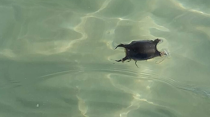 Gaeta, fotografata borsa del diavolo nel mare di Serapo – E’ stata fotografata e postata nel Gruppo Facebook “Sei di Gaeta se…” la foto di uno strano pesce in acqua. Simile ad un pezzo di corteccia o un rintaglio di plastica, non è altro che un uovo di razza, comunemente chiamato “borsa del diavolo” o “borsa della sirena”; inconfondibile per la presenza di alcune protuberanze filiformi alle quattro estremità.
