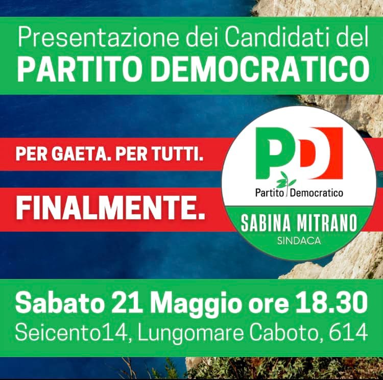 Gaeta, il PD presenta i suoi candidati – Sabato 21 maggio il Partito Democratico di Gaeta presenterà alla cittadinanza il programma elettorale e la sua lista a sostegno della candidatura a Sindaca di Sabina Mitrano alle 18 e 30 presso il Bar Pizzeria Seicento14 a Via Lungomare Caboto 614. Con la sua partecipazione alle elezioni il Partito Democratico vuole contribuire a costruire la Gaeta del futuro, accogliente e vivibile 365 giorni l’anno, una città per tutti in cui la tutela del bene comune sia sempre la priorità dell’Amministrazione Comunale.