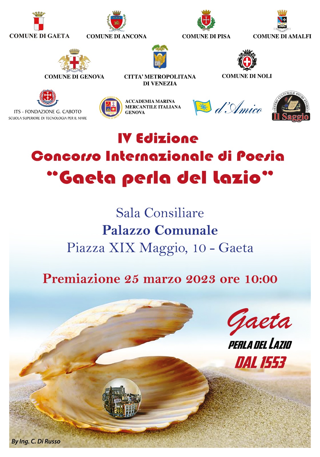 Gaeta perla del Lazio: il prossimo 25 marzo la premiazione del concorso di poesia dedicato al mare – Sabato, 25 marzo 2023, alle ore 10, presso la sala consiliare del Palazzo Comunale di Gaeta (LT), si terrà la premiazione della IV Edizione del concorso internazionale di poesia Gaeta perla del Lazio. Il concorso e la manifestazione sono promossi dal Centro Culturale Studi Storici “Il Saggio” di Eboli con il patrocinio di ITS – Fondazione Giovanni Caboto di Gaeta, Comune di Gaeta, Comune di Ancona, Comune di Pisa, Comune di Amalfi, Comune di Genova, Città Metropolitana di Venezia, Comune di Noli, Accademia Marina Mercantile Italiana di Genova e d’Amico International Shipping. Su circa 300 partecipanti verranno premiati, a vario titolo, 52 finalisti aderenti alla sezione A (tema libero in italiano e vernacolo), sezione B (tema “il mare”) e sezione C (giovani fino ai 18 anni). L’ingresso è libero e gratuito.
