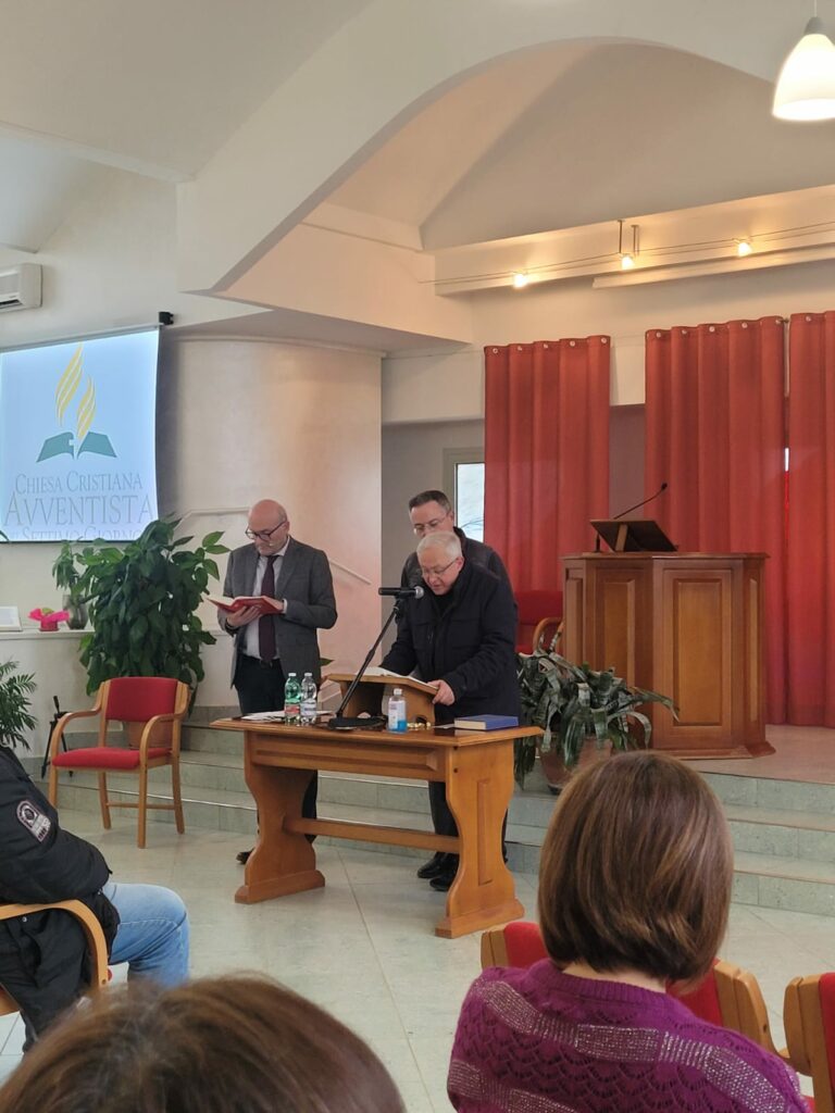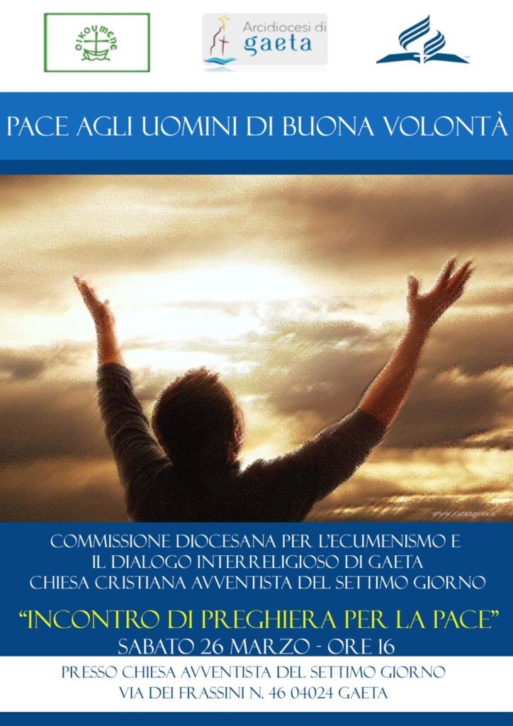 Sabato 26 marzo 2022 preghiera unitaria per la pace a tutti gli uomini di buona volontà. L’evento si è tenuto nella Chiesa Avventista di Gaeta a cura degli stessi e della Commissione Diocesana di Gaeta per l’Ecumenismo, il Dialogo Interreligioso e i Nuovi Culti. Insieme nel nome della stessa fede cristiana perchè l’amata terra d’Europa ritrovi il dialogo e la pace. E’ l’auspicio di tutti noi. Hanno saputo esprimerlo al meglio il Pastore avventista, il vicario foraneo don Stefano Castaldi e il direttore della Commissione don Antonio Cairo, già protagonista la sera prima di un altro evento in sintonia con la preghera del Santo Padre.