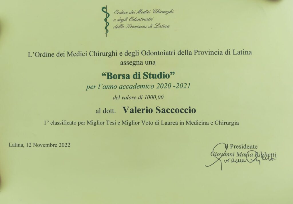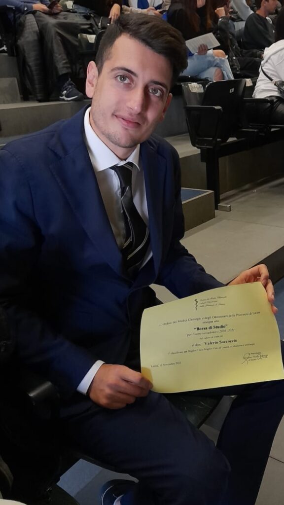 Il Dott. Valerio Saccoccio originario di Itri premiato dall’Ordine dei Medici di Latina – E’ stato premiato dall’Ordine dei Medici Chirurghi e dagli Odontoiatri della Provincia di Latina il Dott. Valerio Saccoccio, originario di Itri, classe ’95, presso il liceo Classico Dante Alighieri di Latina per la “Miglior tesi di Laurea” oltre che “Miglior Voto”. Il Dott. Valerio Saccoccio ha conseguito con votazione 110 e Lode la Laurea Magistrale in Medicina e Chirurgia in data 25 novembre 2021 presso la prestigiosa Università degli Studi di Roma “La Sapienza” e grazie alla Tesi di Laurea: “Verifica della qualità della dieta Gluten Free nei pazienti affetti da celiachia refrattaria mediante analisi con IDK Gluten Fecal ELISA test” il 12 novembre scorso si è aggiudicato oltre alla premiazione anche una borsa di studio del valore di 1.000 euro. Immensa la soddisfazione per il papà Giovanni (di seguito in foto), affermato Infermiere, Caposala del reparto di Chirurgia della Casa del Sole di Formia, della madre Carmina Macone, della famiglia tutta. Avere un concittadino così brillante e preparato onora l’intero Golfo di Gaeta e noi della redazione ci congratuliamo per il risultato raggiunto.