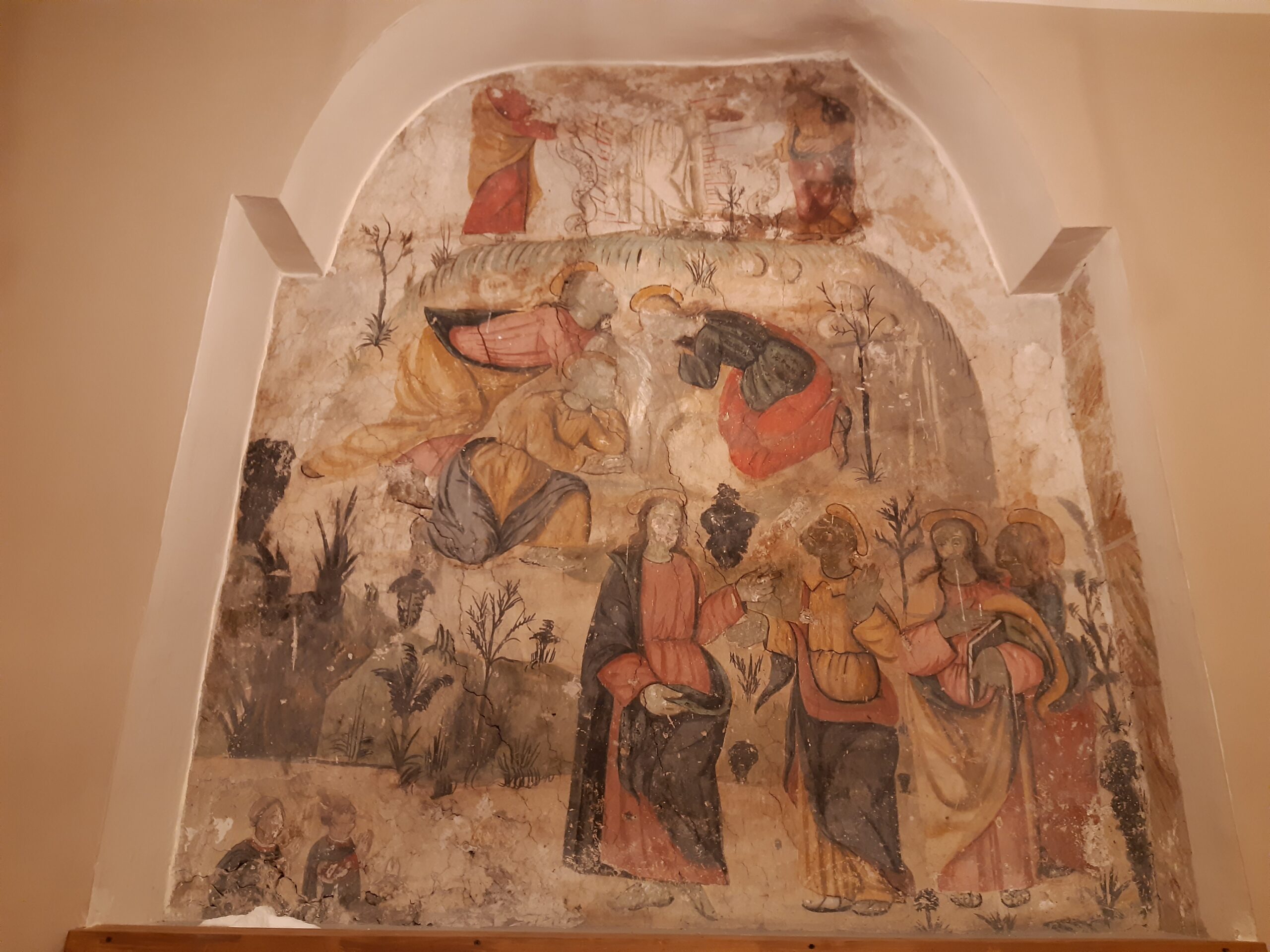L’unico resto dell’antica chiesa, quasi interamente distrutta, nell’ultima guerra mondiale, dai bombardamenti angloamericani, è il dipinto posto sulla parete di una sala del “Bar centrale”. L’affresco raffigura “Gesù Cristo nell’Orto degli Ulivi e la Resurrezione”. Esso, in discreto stato di conservazione, è perfettamente leggibile e può assegnarsi, senza dubbio, al XIV secolo, ascrivibile alla scuola umbra, forse al pennello di Ottaviano Nelli o a qualche allievo di Gentile da Fabriano. Le figure, armoniche, sono ampiamente modellate. Vi cogliamo una lirica intuizione del valore spaziale e musicale del paesaggio. Inquadrati in un’incorniciatura architettonica altrettanto armonica quanto semplice, immersi nella solitaria quiete del paesaggio digradante in dolci modulazioni, sotto la luminosa immensità dei cieli, i personaggi dello sconosciuto artista hanno una grazia straordinaria, che partecipa, con mirabile equilibrio, all’alta malinconia implicita nel ritmo stesso degli spazi. L’opera rivela un gusto per la precisione e per la finitezza. Essa, caratterizzata dal rigore della stesura prospettica e dalla geometrica perfezione dei volumi, è immersa in una luminosità diffusa e sottile, vibrante di trasparenze e di rosate morbidezze.