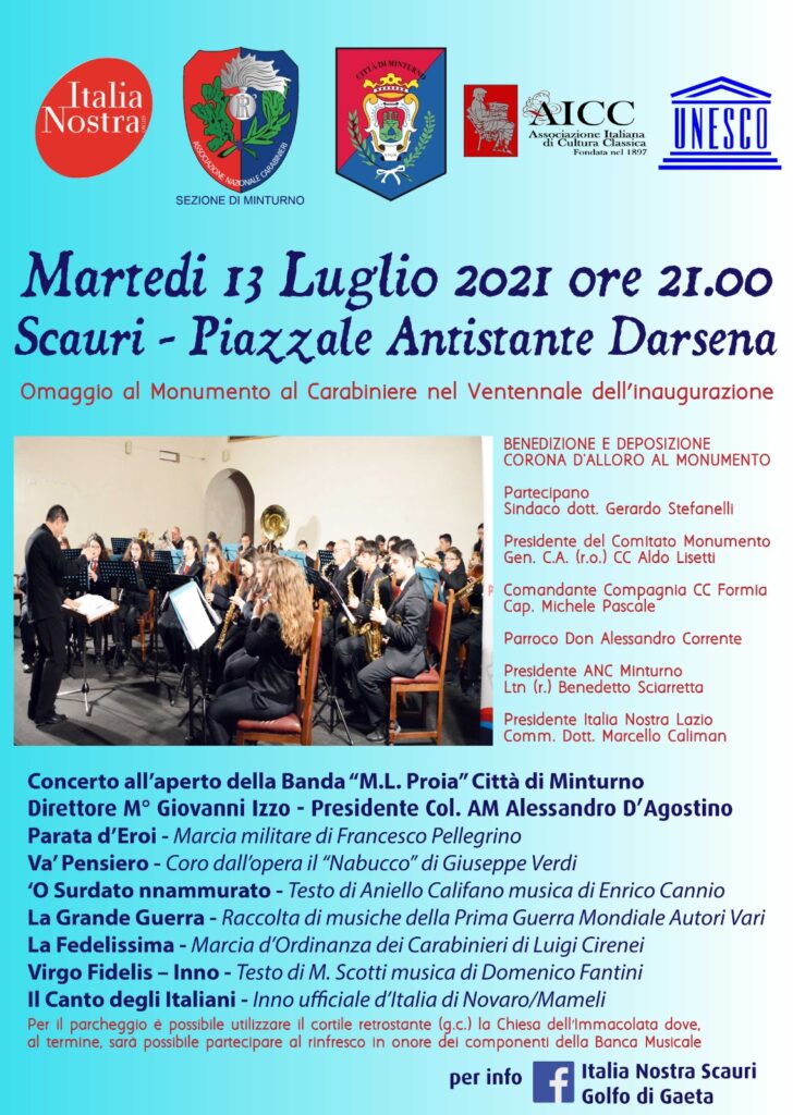 A Scauri insiste da venti anni l’unico Monumento al Carabiniere realizzato nella provincia di Latina dallo scultore Gerardo De Meo di Maranola. Quest’anno Italia Nostra che si è resa già protagonista a maggio dell’inaugurazione di un monumento marmoreo, nella stessa area, dedicato ad Alfonso V d’Aragona re di Napoli detto Il Magnanimo organizza per il ventennale un Concerto della Banda M.L. Proia Città di Minturno, diretta dal Maestro Giovanni Izzo. L’associazione omonima è presieduta dal Colonnello dell’Aeronautica Militare Alessandro D’Agostino.
