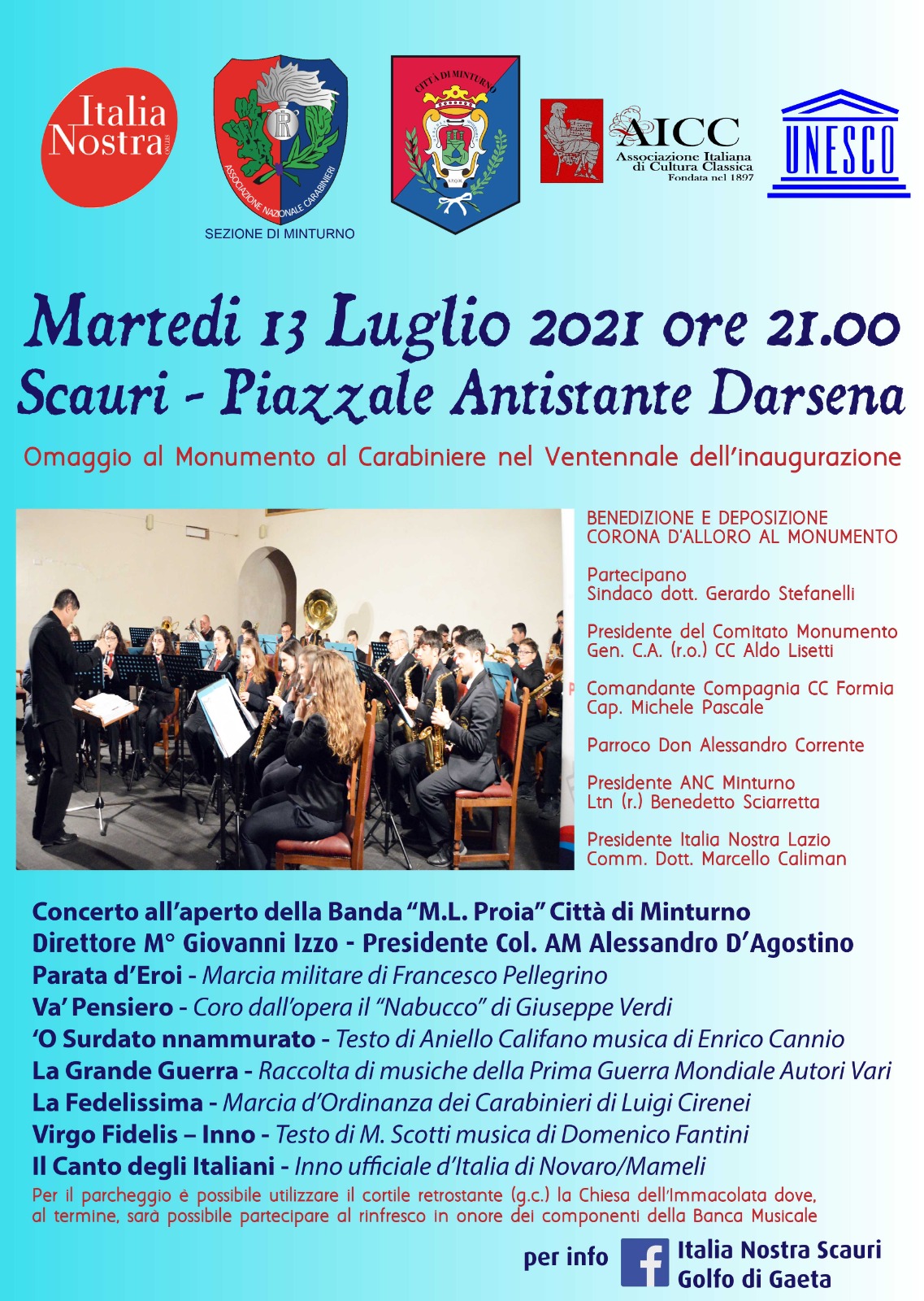 Come si evince dalla lettura del programma il Maestro Giovanni Izzo d’intesa con gli organizzatori vuole impostare la serata su musiche patriottiche che rendono omaggio a tutti coloro che con gli alamari si sono sacrificati per la nostra amata Patria. Italia Nostra non è sola in questo progetto in quanto al suo fianco vi è l’ANC – Associazione Nazionale Carabinieri – Sezione di Minturno presieduta dal Luogotenente Benedetto Sciarretta ed anche quella di Formia presieduta dal Maresciallo Gerardo Pistillo.
