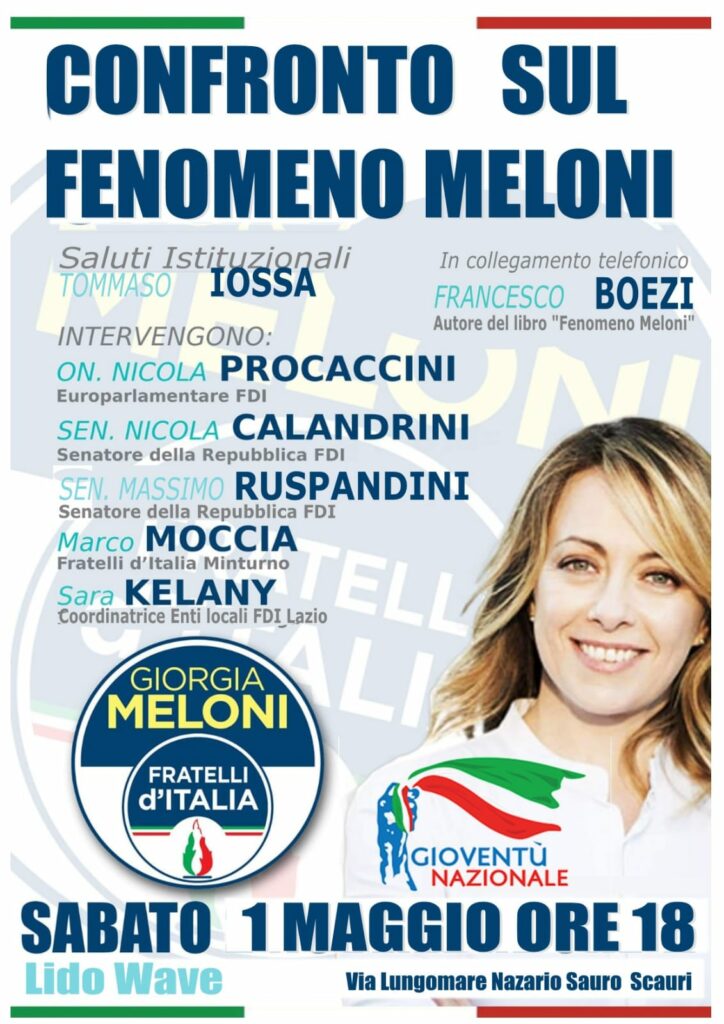 Si terrà sabato 1 Maggio, alle ore 18, all’interno del Lido Wave, l’incontro organizzato da FdI per presentare il libro “Fenomeno Meloni” scritto da Francesco Boezi che sarà in collegamento da Roma. Interverranno durante l’evento Tommaso Iossa, l’onorevole Nicola Procaccini, europarlamentare, il senatore Nicola Calandrini, il senatore Massimo Ruspandini, Marco Moccia, coordinatore di FdI Minturno, e Sara Kelany coordinatrice Enti Locali FdI Lazio.