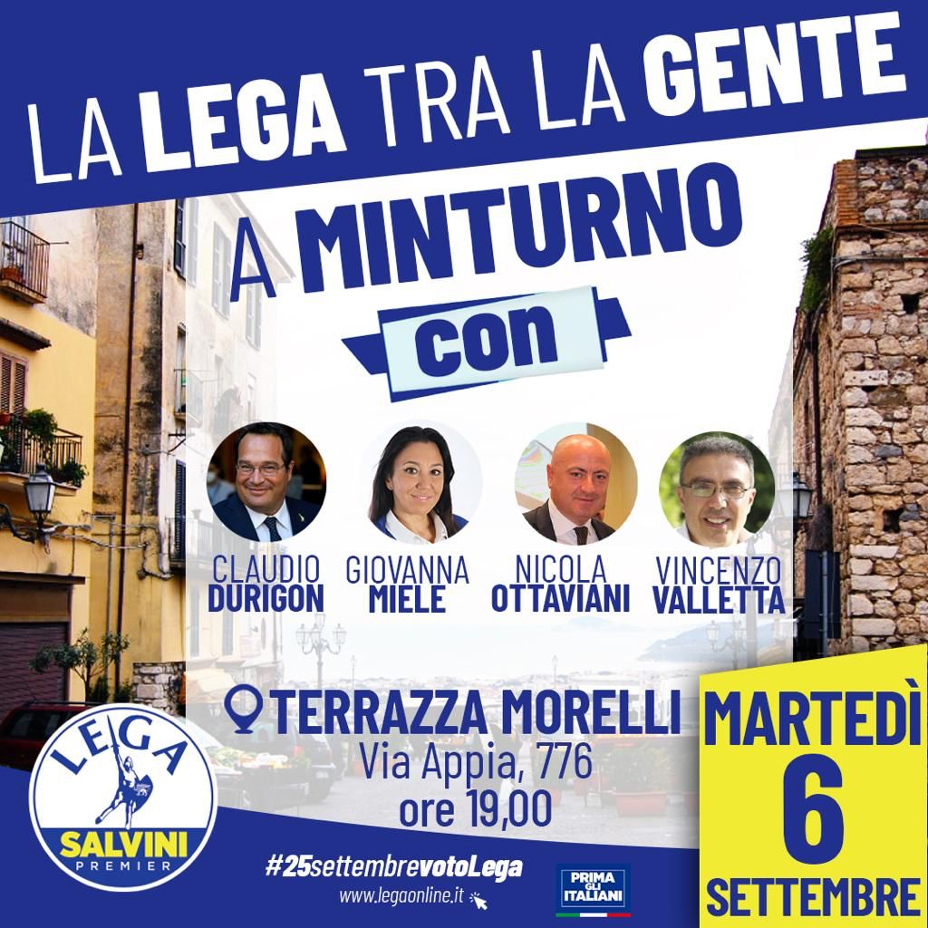 La Lega tra le gente: Terrazza Morelli, martedì 6 settembre – Martedì 6 settembre alle ore 19:00 a Scauri presso la Terrazza Morelli, appuntamento politico con “La Lega tra la gente”. Sarà presente Claudio Durigon, Giovanna Miele, Nicola Ottaviani e Vincenzo Valletta.