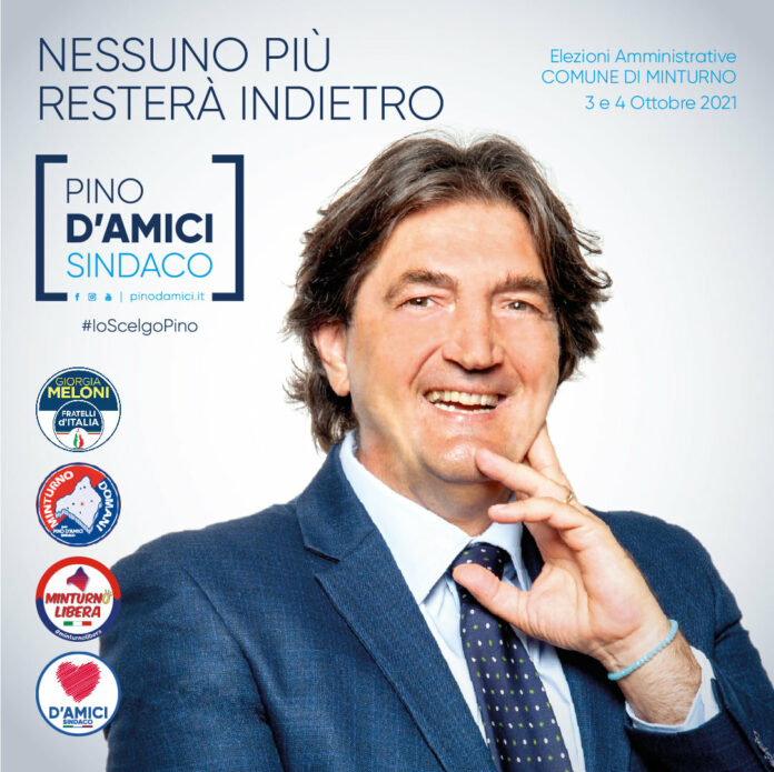 Minturno - Il candidato sindaco Giuseppe D'Amici, è in corsa con quattro liste: Fratelli d'Italia, Minturno Domani, Minturno Libera e D'amici Sindaco. Di seguito tutti i candidati delle liste: Lista Fratelli d'Italia: Amitrano Daniele Cappuccia Fabiana Falduto Filomena Forte Giuseppe Graziano Angelo Iazzetta Emilia Larocca Francesco Mitrano Franco Moccia Marco Reitano Riccardo Rubino Antonella Sarnacchiaro BiancaBruna Tartaglia Silvia Toscano Enzo Tucciarone Gerardo Tuccillo Antonietta Lista Minturno Domani: Alvino Emanuela Barretta Claudio Ciaraldi Marco Conte Antonio Cuciniello Federico De Galizio Gustavo Di Fraia Francesco Mazzucco Angelo Molino Deborah Pentimalli Livio, detto Livio Polidoro Giacomo Portogallo Antonella Sardelli Barbara Scionti Rossana Stella Maria Anastasia Treglia Giovanni Lista Minturno Libera: Polidoro Emilio Lungo Maria Pia Poccia Marilena Varriale Salvatore Di Girolamo Mario Astone Roberto Pascolo Federico Cavallo Federico Morlando Franco Sclano Giuseppe Di Principe Gianni Ferraro Alessandra Clotilde Gentile Cardillo Lucia Sparagna Irene Lista D'Amici Sindaco: Bergantino Gerardo Cassi Antonia Chiericoni Pietro Di Rienzo Francesco Esposito Michael Fico Pasquale Iovine Barbara Marino Silvestro Montana Michela Pagano Luca Palmentieri Antonio Pantusa Arianna Passaro Immacolata Perrotta Francesca Seredyszyn Malgorzata Zinicola Filippo