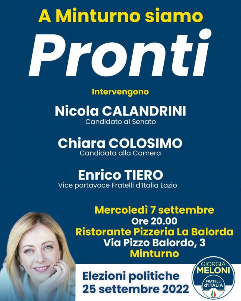 Il direttivo cittadino di Fratelli d’Italia Minturno, comunica di aver organizzato per mercoledì 7 settembre un incontro elettorale presso la pizzeria “La Balorda” alle ore 20, al fine di presentare alla cittadinanza minturnese il programma ed i candidati alla Camera dei deputati ed al Senato del partito di Giorgia Meloni. “Sono onorato della presenza dei candidati del nostro collegio qui a Minturno – dichiara Vincenzo Fedele, coordinatore cittadino di Fdi – ringrazio i vertici del partito per avermi dato subito la loro disponibilità e per la considerazione che ripongono nei confronti del direttivo cittadino e della nostra città. Sono certo che il partito a Minturno otterrà un grande risultato forte anche del radicamento territoriale e del grande lavoro dei nostri consiglieri comunali”. Concludono i consiglieri comunali Avvocato Pino D’amici e Architetto Francesco Larocca: “siamo orgogliosi di rappresentare Fratelli d’Italia nel consiglio comunale di Minturno e siamo altrettanto orgogliosi della fiducia riposta dal partito nei confronti della nostra comunità militante. Invitiamo la cittadinanza ad essere presente per ascoltare e contribuire alla crescita di Fratelli d’Italia che sarà sicuramente la grande sorpresa delle elezioni politiche del 25 settembre”. Intervengono Nicola Calandrini, candidato al Senato; Chiara Colosimo, candidata alla Camera; Enrico Tiero vice portavoce per il Lazio del partito.