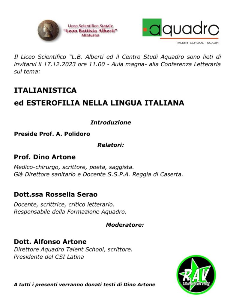 Sabato 17 dicembre con inizio alle ore 11.00 grazie alla costante disponibilità del dirigente scolastico prof. Amato Polidoro presso l’Aula Magna “Ing. Maurizio Bisegna” del Liceo Scientifico Statale Leon Battista Alberti di Marina di Minturno è in programma una conferenza letteraria promossa dal medico e scrittore dott. Dino Artone con i loghi del Liceo e dell’Aquadro – Talent School di Scauri e, infine, con la collaborazione della RAV – Radio Antenna Verde. Il tema della conferenza è “Italianistica ed Esterofilia nella lingua italiana”. Apertura dei lavori a cura del preside e quindi relatori il dott. Dino Artone, scrittore e poeta affermato, quindi la dottoressa Rossella Serao, critico letterario e responsabile della Formazione Aquadro. Modera il dottor Alfonso Artone, direttore della Aquadro Talent School, nonché scrittore e presidente provinciale della CSI di Latina. A tutti i presenti verranno donati testi di Dino Artone. Una mattinata culturale indubbiamente interessante.