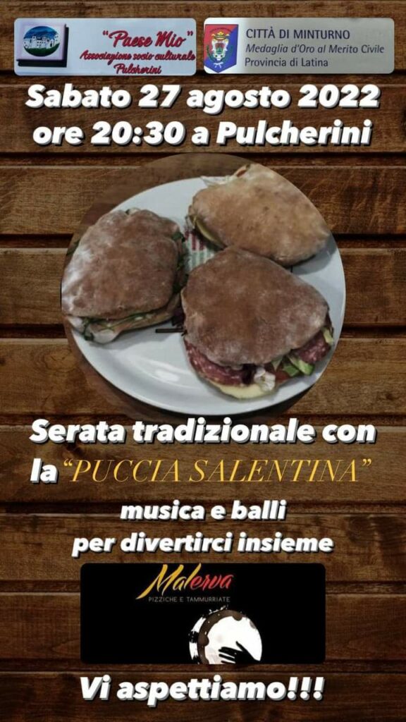 La Sagra di stasera a Pulcherini dedicata alle pucce salentine può essere l’inizio di una tradizione annuale. E il tutto nasce da due atti d’amore. Il primo di Rocco Pelle, che da quaranta anni è presidente dell’Associazione Paese Mio, e si spende per il suo paesello, affermando che. “sino a quando avrò forza e Pulcherini avrà un alito di vita con residenti e turisti io mi impegnerò per rivitalizzare la nostra splendida frazione collinare.” Incomparabile la Passione Vivente che l’associazione Paese Mio organizza da “illo tempore”. Una delle figlie di Rocco è l’avvocato Ilaria Pelle, assessore ai servizi sociali che si sta facendo apprezzare per le sue capacità e la sua dedizione. Il secondo atto d’amore è quello tra un giovane pugliese e una ragazza di Pulcherini che ha consentito di importare tale tradizione culinaria. Le pucce sono forme di pane aventi diametro di circa 20 – 30 centimetri facenti parte della tradizione culinaria della Puglia centromeridionale. In particolare tale tradizione è molto diffusa nel Salento e nel tarantino. Ogni puccia è del peso di circa 230 grammi e sono squisite anche in virtù del companatico. Saranno messe in vendita a prezzo calmierato. La serata inizia alle 20.30 e la degustazione sarà allietata da musica e balli per il divertimento di tutti insieme. L’evento gode del patrocinio del Comune di Minturno.