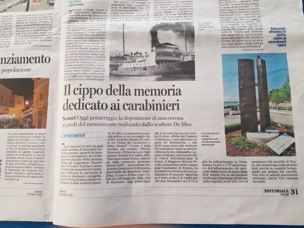 Sono trascorsi 21 anni da quel freddo mattino di dicembre (nevicava persino) quando fu inaugurato il Monumento al Carabiniere nel piazzale della Darsena Flying sul Lungomare Nazario Sauro di Scauri. Il primo e ancora l’unico Monumento al Carabiniere realizzato in provincia di Latina su ideazione e progettazione di Italia Nostra e grazie alla maestria dello scultore Gerardo De Meo. Il comandante generale scrisse in un messaggio che vi era “perfetta identità di vedute tra l’Arma dei Carabinieri e Italia Nostra”. L’Arma è stata fondata dal sovrano Vittorio Emanuele I di Savoia con le regie patenti firmate il 13 luglio 1814. Ogni anno Italia Nostra coinvolge nella cerimonia doverosamente l’ANC – Associazione Nazionale Carabinieri di Minturno, presieduta da Benedetto Sciarretta. Il rosso e il bleu sono i colori sia dell’Arma che della città di Minturno. Oggi sabato 23 luglio alle 18.30 sarà deposta una corona di alloro offerta dal Comune di Minturno (come ogni anno) ai piedi del Monumento e alle 19.00 santa messa alla memoria dei carabinieri caduti in servizio officiata da don Alessandro Corrente all’aperto, nel piazzale della Chiesa dell’Immacolata di Scauri. Il Maggiore Michele Pascale, comandante della Compagnia Carabinieri di Formia, ufficiale preparato e sempre disponibile, impegnato nelle Isole Ponziane per l’anniversario dell’affondamento del Piroscafo Santa Lucia ha garantito la presenza del Comandante del Nucleo Radiomobile della Compagnia di Formia Tenente Agostino Pellegrino e dei suoi due comandanti di stazione (Scauri e Minturno rispettivamente Maresciallo Capo Maicol Monnanni e Luogotenente Bruno Avolio in rappresentanza del comandante Luogotenente c.s. Pasquale Raucci, assente per ferie. Parimenti sarà rappresentato il Comandante della Capitaneria di Porto – Guardia Costiera di Gaeta Cap. di Fregata (CP) Angelo Napolitano, impegnato anche lui nelle Isole Ponziane. Quest’anno è stato scelto il 23 luglio perché don Alessandro era il 13 luglio in pellegrinaggio in Terra Santa e inoltre è il 79°anniversario dell’affondamento del Piroscafo Santa Lucia da parte della RAF mentre era in navigazione tra Ponza e Ventotene. Morirono nella tragedia, tra gli altri, ben 14 carabinieri del presidio di Ponza, che rientravano nelle proprie isole perché in congedo temporaneo per aiutare nei raccolti. Uno solo si salverà gravemente ustionato. Anche loro saranno ricordati. Il Comune di Minturno sarà rappresentato dal vice sindaco Elisa Venturo. Italia Nostra ringrazia il giornalista Gianni Ciufo per il puntuale servizio odierno pubblicato sul quotidiano cartaceo Latina Oggi.