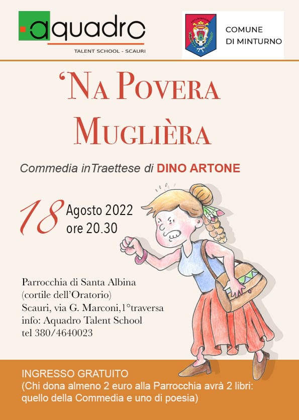 Grande attesa per assistere alla commedia comica in traettese dello scrittore e poeta Dino Artone, di professione medico chirurgo – direttore sanitario nella ASL di Latina, in atto unico “Na povera muglièra” avvalendosi di una brava attrice quale è Marina Casaburi, e di un segretario imbranato quale è chi scrive. Lo spettacolo sarà aperto e chiuso da un canto “La Mugliera”, eseguito dai ragazzi del Coro di Aquadro Talent School, diretti da Maria Civita Frate, che canteranno questa canzone in parte ridotta di Da Vinci – Lazzaro. Il protagonista avvocato Consiglio Carastuso duetterà con una donna del popolo che ha avuto quattro mariti e quattro figli. E’ un lavoro brioso e divertente, impreziosito dalla recitazione dell’autore stesso e della donna che si rivolge al suo studio. Un appuntamento da non perdere e che si deve alla disponibilità preziosa del parroco don Antonio Cairo. Il saluto del Comune di Minturno che ha patrocinato l’evento sarà portato dalla professoressa Rita Alicandro, assessore alla cultura e alla pubblica istruzione. I figli dell’autore hanno fatto la loro parte, dal disegno della brava Lara Artone all’l’organizzazione di Alfonso Artone, direttore della Aquadro, talent school di Scauri. Preziosa anche Emanuela Artone.