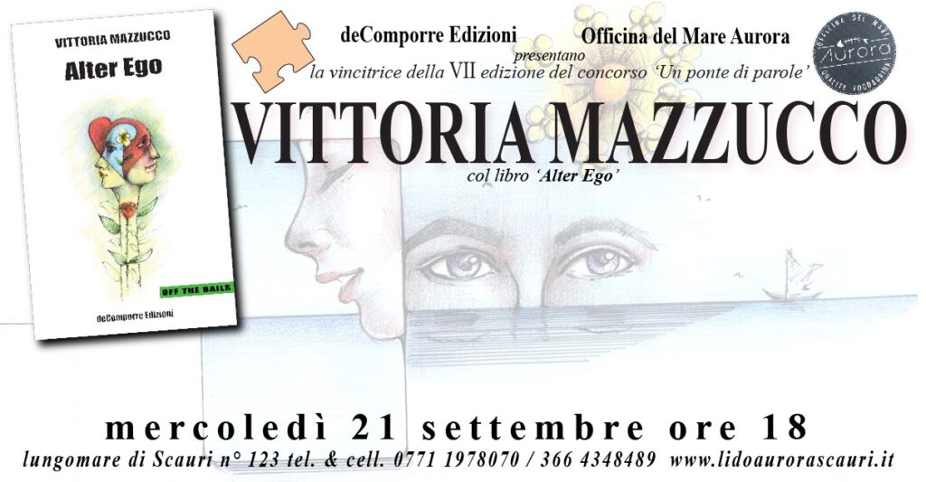 La docente Vittoria Mazzucco, donna volitiva e dinamica, con la sua opera “Alter Ego” de Comporre Edizioni ha vinto la settima edizione del Concorso “Un Ponte di Parole” della stessa casa editrice. L’opera sarà presentata grazie alla collaborazione della “Officina del Mare Aurora” mercoledì 21 settembre 2022 alle ore 18.00 presso il Lido Aurora. Il dinamico Aristide Contadini imprenditore balneare, intelligente è sempre disponibile, ha messo a disposizione il lido. Auguri Vittoria (nella foto di copertina) e complimenti.