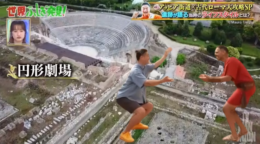 La trasmissione era incentrata alla Via Appia e con delle simpatiche gag del “cacciatore di misteri” Hiroyuki Takagishi, sono stati spiegati ai telespettatori nipponici, la storia e le caratteristiche di alcuni dei luoghi più importanti del tracciato viario e tra questi, non poteva certamente mancare il Comprensorio archeologico di Minturnae.