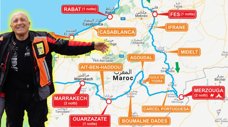 Sarà un qualcosa di unico, oltre che per il numero eccezionale di partecipanti, tutti motociclisti di livello a bordo di 37 BMW, 7 Ducati, 4 KTM, 3 Yamaha, 2 Guzzi, 2 Honda, 2 Triumph, 1 Aprilia e 1 Suzuki, per l’itinerario di quasi 5000 chilometri che ci porterà a visitare la città blu di Chefchaouen, per poi inoltrarci nel deserto del Sahara toccando la prima delle città imperiali che visiteremo, Fes, e poi giù fino a Merzouga dove dormiremo in tenda.