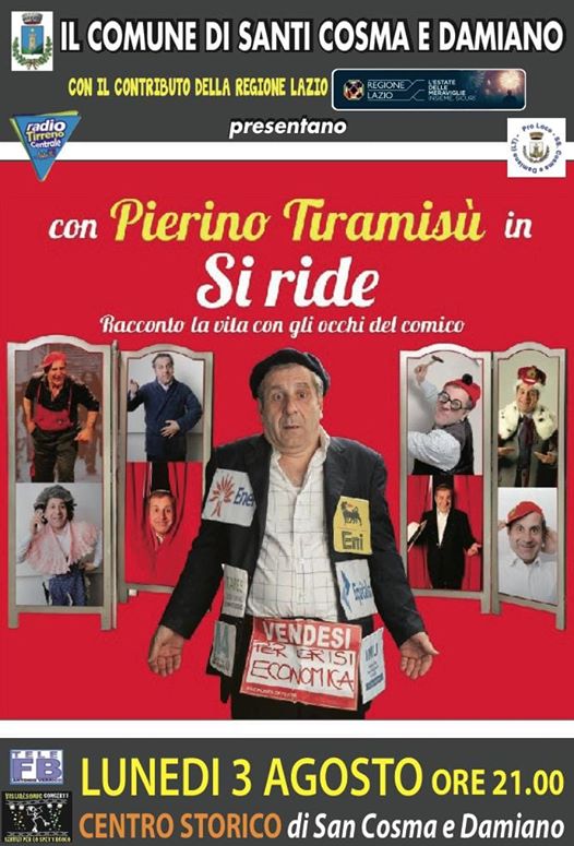 Il Comune di Santi Cosma e Damiano, con il contributo della Regione Lazio, e in diretta con RTC, presentano stasera alle 21.00 presso il centro storico, la commedia comica “Si ride, racconto la vita con gli occhi del comico, con Pierino Tiramisù”. L’evento è gratuito.
