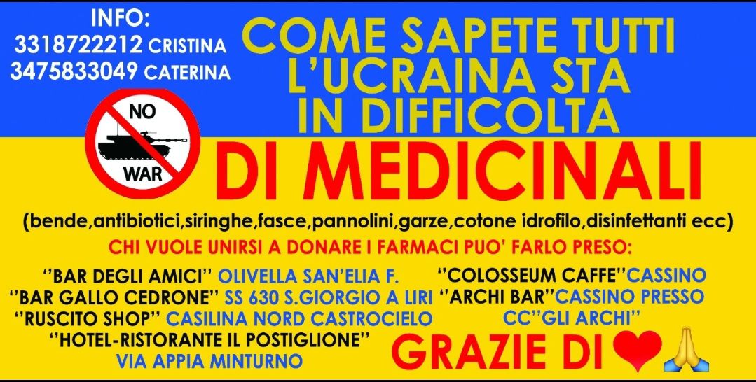 SOS Ucraina: anche nel golfo di Gaeta è in moto la macchina della solidarietà – In particolare alcuni volontari stanno raccogliendo farmaci e prodotti sanitari da inviare nelle terre interessate dal conflitto. Il punto più vicino di raccolta è l’hotel ristorante il Postiglione a Minturno sulla via Appia da noi contattato il quale ha confermato di essere un punto di raccolta.