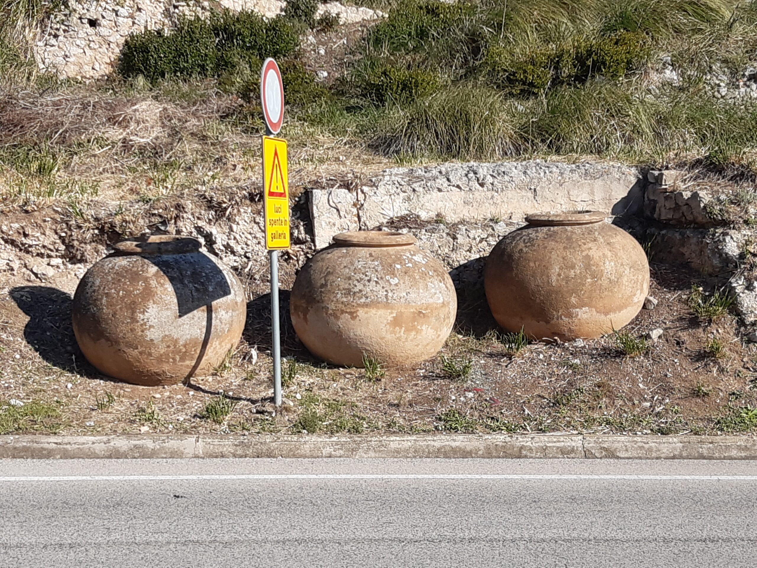 Sperlonga ci viene incontro con i suoi dolia – Quando si va da Gaeta verso Sperlonga, poco prima della Grotta di Tiberio, si vedono sulla destra dei vasi di grandi dimensioni e al di sotto di questi un muro antico. Nella piacevole conversazione con l’archeologa Marisa De Spagnolis si è parlato anche di questi vasi che sono per l’esattezza dei dolia, grandi contenitori che i romani utilizzavano per conservare e trasportare o vino o cereali perché molto resistenti e mantenevano fresco il contenuto. Il dolium dei Romani, corrispondente al πίϑος dei Greci, era usato quindi per contenere derrate alimentari di liquidi (vino, olio, ecc.) o anche di aridi (grano, legumi) da trasportare e poi conservare nei magazzini. La forma del πίϑος è prevalentemente quella di un tronco di cono rovescio, con larga bocca; quella del dolio invece è globulare, con base abbastanza ampia. L’altezza era compresa fra 1,50 e 1,60 metri e larghezza superiore a 1,50 metri nel punto di massima espansione.