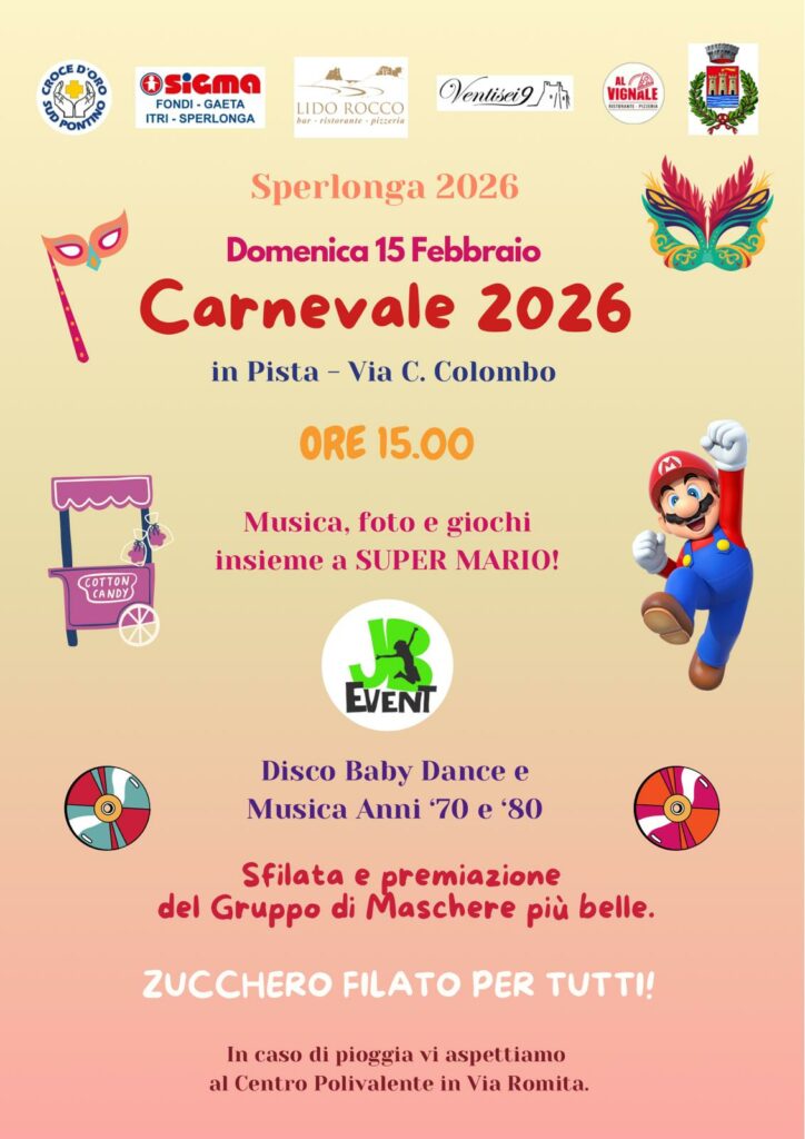 L’iniziativa è realizzata con il supporto di attività commerciali locali e associazioni del territorio, confermando ancora una volta l’impegno della comunità nel promuovere momenti di aggregazione e socialità. Il Carnevale di Sperlonga 2026 si annuncia quindi come un’occasione imperdibile per vivere una giornata di festa, tradizione e divertimento condiviso. Di seguito la locandina dell’evento: