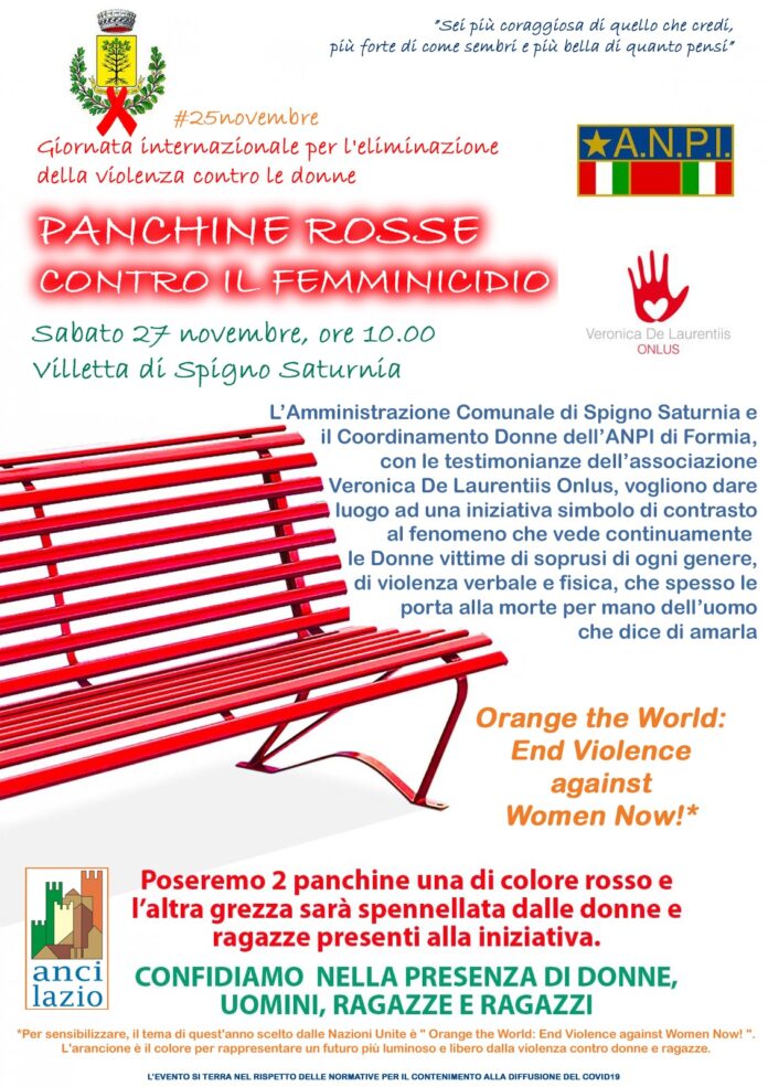 In occasione della giornata internazionale per l’eliminazione della violenza contro le donne, saranno installate due panchine, una di colore rosso e l’altra grezza che sarà spennellata simbolicamente con il colore rosso dalle donne e dalle ragazze presenti all’iniziativa, che si terrà sabato 27 novembre alle ore 10.00 presso la villetta comunale di Spigno Saturnia.