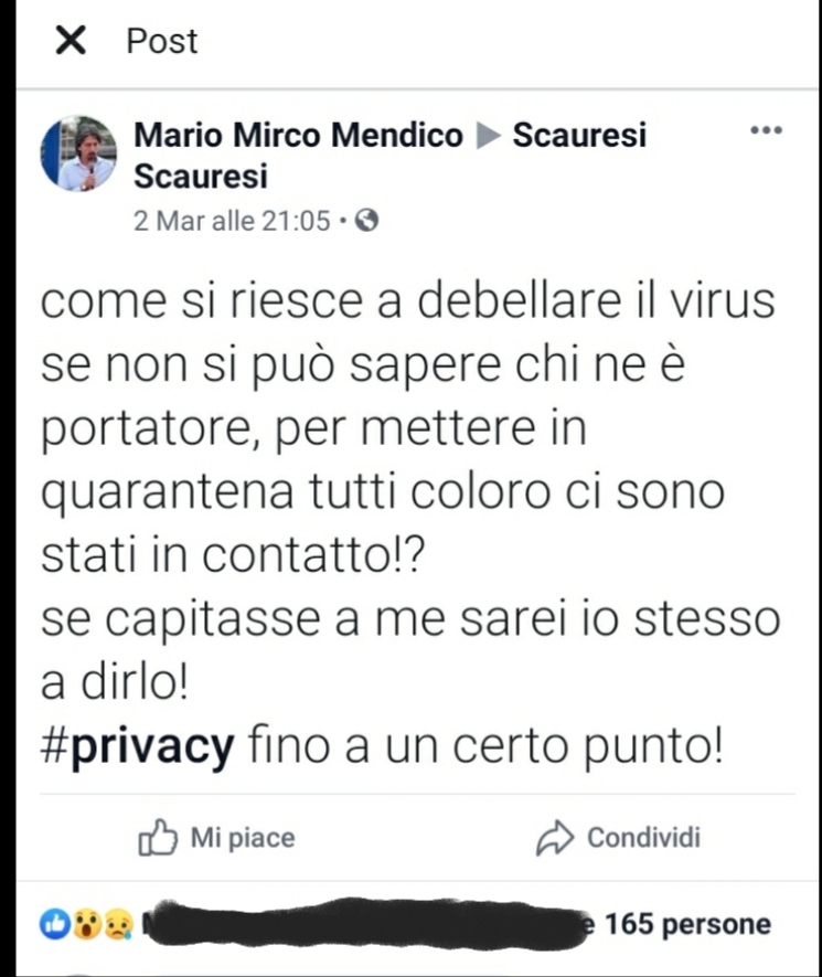 Non possiamo sottacere, perciò, di fronte all’uscita totalmente fuori luogo del delegato alla memoria storica, specializzato in raccolta di cartoline e spezzoni di film, Mario Mirco Mendico, il quale su un gruppo facebook pubblico, che conta oltre 10000 membri, invitava a non osservare le normative in materia di privacy e a rendere pubblico il nome dell’”untore”, in barba a qualsiasi legge in materia di trattamento dei dati personali e a qualsiasi protocollo medico.