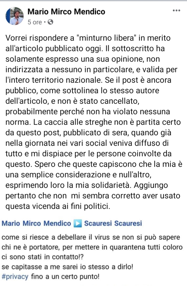Ancora più sconcertante è stato rilevare che lo stesso autore del post non ha mai tentato di stoppare questo scempio, tant’è che il post, ancora ben visibile, non contiene alcun intervento volto a placare gli animi e a inviare un messaggio di vicinanza alla famiglia e alle persone malate che, secondo noi, doveva essere il primo atto che doveva fare un rappresentante delle istituzioni comunali in un momento così delicato, mentre invece il delegato Mendico ha solo tentato di fare incetta di like e acquisire i consensi lanciando una Santa Inquisizione moderna e cavalcando e moltiplicando la paura dei minturnesi.