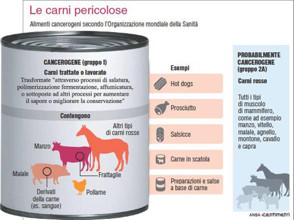 Gli altri tre ambiti di azione sono lo screening precoce, il miglioramento dell’accesso a diagnosi e trattamenti innovativi, il miglioramento della qualità di vita dei pazienti e di chi è guarito. Infatti afferma l’IARCA – International Agency for Research on Cancer dell’OMS: “Le carni lavorate come i wurstel sono cancerogene, e vanno inserite nel gruppo 1 delle sostanze che causano il cancro a pericolosità più alta come il fumo e il benzene. Meno a rischio quelle rosse non lavorate, inserire fra le probabilmente cancerogene”. La decisione è stata presa, si legge nel documento, dopo aver revisionato tutti gli studi in letteratura sul tema: “Il gruppo di lavoro ha classificato il consumo di carne lavorata nel gruppo 1 in base a una evidenza sufficiente per il tumore colorettale. Inoltre è stata trovata una associazione tra consumo e tumore allo stomaco. La possibilità di errore non può invece essere esclusa con lo stesso grado di confidenza per il consumo di carne rossa”. L’OMS – Organizzazione Mondiale della Sanità evidenzia che carni in scatola, hot dog, prosciutto: sono solo alcuni esempi di carni trattate, considerate cancerogene per l’uomo. Sono invece considerate ‘probabilmente cancerogene’ le carni rosse: questa categoria, spiega l’Oms, ”si riferisce a tutti i tipi di carne di muscolo di mammifero, come ad esempio manzo, vitello, maiale, agnello, montone, cavallo e capra”. Le carni trattate o lavorate sono quelle indicate come più pericolose per l’uomo, essendo state inserite dall’OMS nel gruppo 1 per rischio cancerogeno. Le carni lavorate, spiega l’OMS, includono le carni che sono state trasformate ”attraverso processi di salatura, polimerizzazione fermentazione, affumicatura, o sottoposte ad altri processi per aumentare il sapore o migliorare la conservazione”.