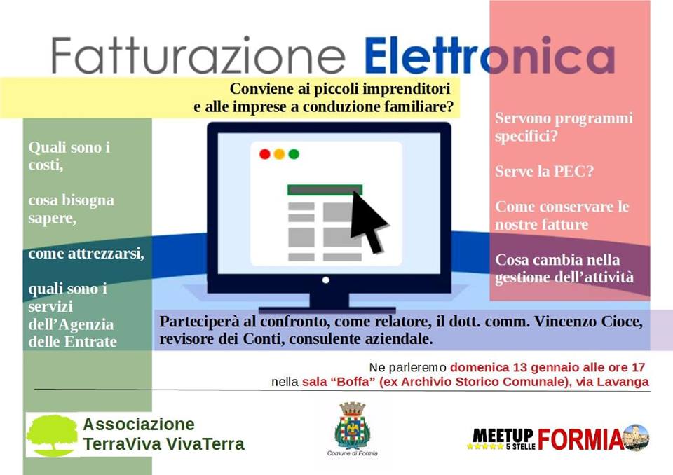 Fatturazione elettronica e Piccole Imprese. E’ questo il titolo dell’appuntamento in programma Domenica 13 Gennaio alle ore 17 presso la “Sala Boffa”, ex Archivio Storico Comunale di via Lavanga n° 140 a Formia. Organizzato dall’associazione “Terra Viva Viva Terra” e promosso dal meetup Formia 5 Stelle, l’evento, dal chiaro intento divulgativo, ha come obiettivo quello di spiegare come è possibile affrontare questa nuova procedura direttamente con gli strumenti messi a disposizione dall’Agenzia delle Entrate, quale la dotazione minima necessaria per gestirla, come conservare le fatture, cosa cambia nella gestione dell’attività, quali i costi e come risparmiare. Tutte domande che potranno essere poste direttamente a Vincenzo Cioce, dottore commercialista, revisore dei Conti e consulente aziendale che per l’occasione, come relatore, metterà in luce ogni aspetto della normativa.