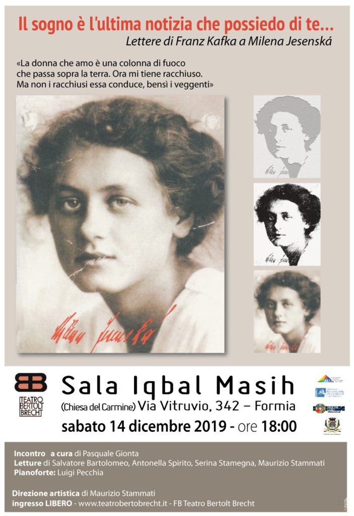 Primo appuntamento dedicato all’epistolario di Franz Kafka a Milena Jesenská, a cura di Pasquale Gionta, con la direzione artistica di Maurizio Stammati, letture di Salvatore Bartolomeo, Antonella Spirito, Serina Stamegna e Maurizio Stammati, e con l’accompagnamento pianistico di Luigi Pecchia.