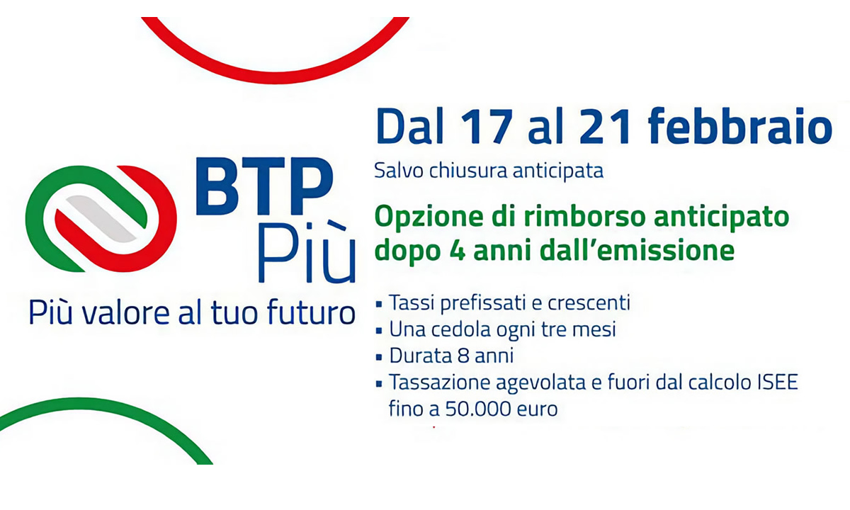 Interessi BTP Più, il collocamento e le novità di questa emissione – Al via l’emissione del BTP Più, il primo titolo dedicato ai piccoli risparmiatori con opzione di rimborso anticipato del capitale dopo 4 anni. Il collocamento avverrà da lunedì 17 a venerdì 21 febbraio 2025 (fino alle ore 13), salvo chiusura anticipata. Il BTP Più appartiene alla famiglia del Btp Valore, i buoni del Tesoro garantiti dallo Stato e dedicati esclusivamente ai piccoli risparmiatori e affini (il cosiddetto mercato retail). Nessuna commissione per i piccoli risparmiatori che acquistano nei giorni di collocamento. Durata 8 anni. Cedole pagate ogni 3 mesi, con rendimenti prefissati crescenti nel tempo secondo il cosiddetto meccanismo step-up di 4+4 anni, ossia con due fasi ciascuna di quattro anni e cedola più alta nella seconda rispetto alla prima