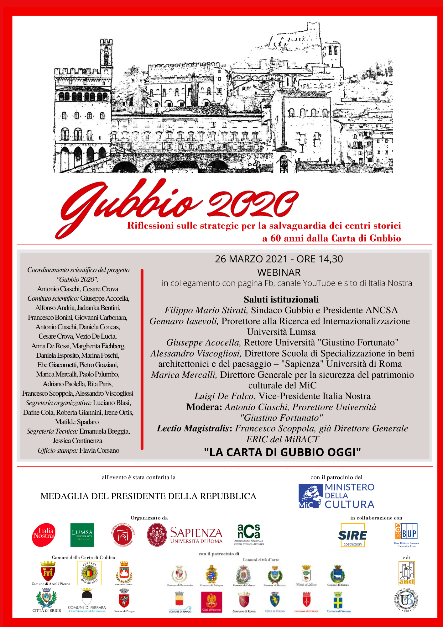 La Carta di Gubbio è la dichiarazione finale approvata all’unanimità a conclusione del Convegno Nazionale per la Salvaguardia e il Risanamento dei Centri Storici (Gubbio, 17-18-19 settembre 1960) promosso da un gruppo di architetti, urbanisti, giuristi, studiosi di restauro, e dai rappresentanti dei comuni di Ascoli Piceno, Bergamo, Erice, Ferrara, Genova, Gubbio, Perugia, Venezia. Le relazioni sono state svolte da: G. Samonà, A. Cederna, M. Manieri Elia, G. Badano, D. Rodella, E.R. Trincanato, G. Romano, L. Belgiojoso, E. Caracciolo, P. Bottoni. Elenco dei soci fondatori esclusi i Comuni: – Ente Provinciale per il Turismo di Perugia − Azienda Autonoma di Soggiorno e Turismo di Gubbio − Istituto per le Case Popolari per la Provincia di Perugia − Prof. Arch. Giovanni Astengo − On. Vinicio Baldelli − Ing. Mario Belardi − Prof. Nicola Benedetti − Prof. Arch. Eduardo Caracciolo − Dr. Luigi Contenti − Prof. Arch. Gisberto Martelli − Avv. Vincenzo Parlavecchio − On. Camillo Ripamonti − On. Mario Roffi − Prof. Arch. Giovanni Romano − Prof.ssa Egle Renata Trincanato