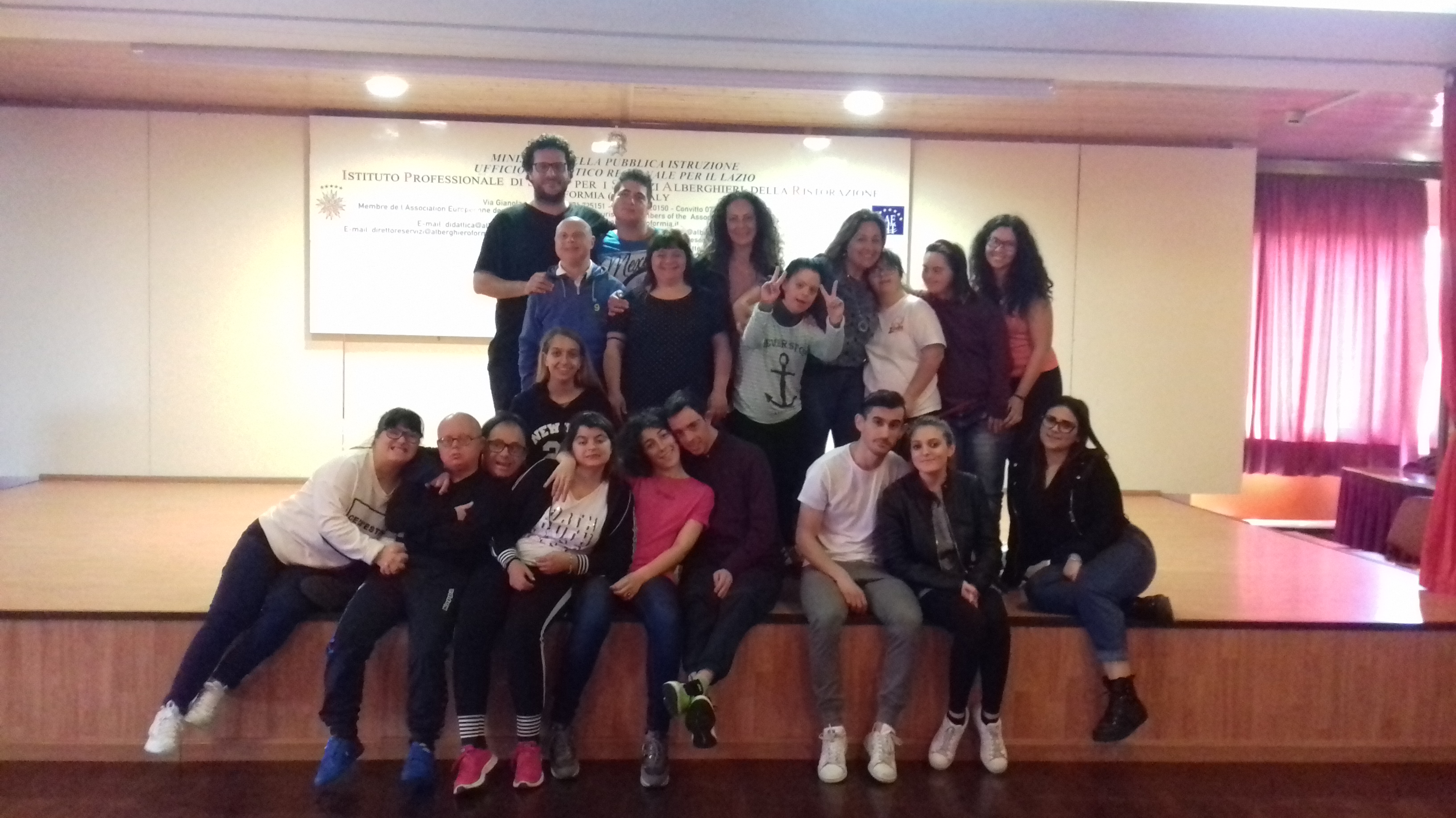 Entriamo in punta di piedi, il laboratorio teatrale è già iniziato e i ragazzi non devono distrarsi. Più tardi scopriremo che Benedetto, 39 anni, che specifica subito che preferisce essere chiamato Benny, vuole fare l’attore, e magari un giorno, poter recitare nella soap “Il Segreto”, che guarda sempre, per poter sconfiggere la malvagia Donna Fancisca. Poi c’è Antonio, 47 anni, a cui piace tanto fare teatro, invece Eugenio, 21 anni, ha iniziato a frequentare il laboratorio perché accompagnava la sua fidanzata, Veronica, studentessa dell’alberghiero, alle prove di recitazione. Poi c’è Silvia, 23 anni, timida ed emozionatissima, riesce solo a dire “E’ bello!”. A Laura, 27 anni, invece non le piaceva il laboratorio che frequentava prima mentre questo, che sta frequentando, le piace tanto ed Elisa, 35 anni, adora lo spirito di gruppo che si è creato. Loro sono alcuni dei 28 ragazzi che frequentano il laboratorio teatrale organizzato all’interno dell’istituto alberghiero Angelo Celletti di Formia in partenariato con la coop Nuovo Orizzonte. Un importante collaborazione, che scaturisce dalla volontà della professoressa Buonaiuto, responsabile del sostegno all’alberghiero, una donna concreta e dal cuore grande, e di Anna Pagano, presidentessa della cooperativa Nuovo Orizzonte e mamma di uno dei ragazzi. La cooperativa nasce nel 2009, su iniziativa di alcuni insegnanti delle scuole superiori di Formia, insieme ad alcuni genitori di alunni ed ex alunni con diversa abilità, con l’intento di promuovere l’integrazione e l’inserimento socio-lavorativo dei giovani disabili e/o con disagio. Nel settore dei servizi e della formazione, cerca di creare occasioni per consentire a ragazzi/e con svantaggio di sperimentare esperienze lavorative adeguate alle potenzialità di ognuno, spendibili poi nel mondo del lavoro, al fine di favorire la partecipazione alla vita sociale in modo completo, attivo e dignitoso. Nel 2014 parte il progetto “INSIEME SI PUO’” nel quale i ragazzi svolgono attività formative e ludico-ricreative, per crescere e prepararsi ad un inserimento
