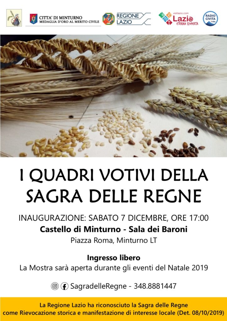 Saranno esposti dieci quadri votivi realizzati a mano, con le spighe e i chicchi di grano, vere e proprie opere d’arte curate dai ‘carresi’ di Minturno per la Sagra delle Regne, la festa del grano che si svolge a Minturno ogni anno nel mese di luglio. Da pochi mesi, inoltre, la Regione Lazio ha riconosciuto la Sagra delle Regne come Rievocazione storica e manifestazione di interesse locale, un riconoscimento dato alle manifestazioni finalizzate alla valorizzazione della storia e della memoria storica del territorio.