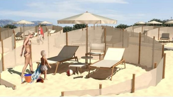 L'idea proposta dai due architetti è quella di perimetrare gli ambiti di fruizione della spiaggia e degli ombrelloni per rispettare le distanze sociali. Un modello realizzabile in autocostruzione, circoscrivendo il perimetro di 5 metri di diametro di ogni ombrellone e con del materiale ecosostenibile