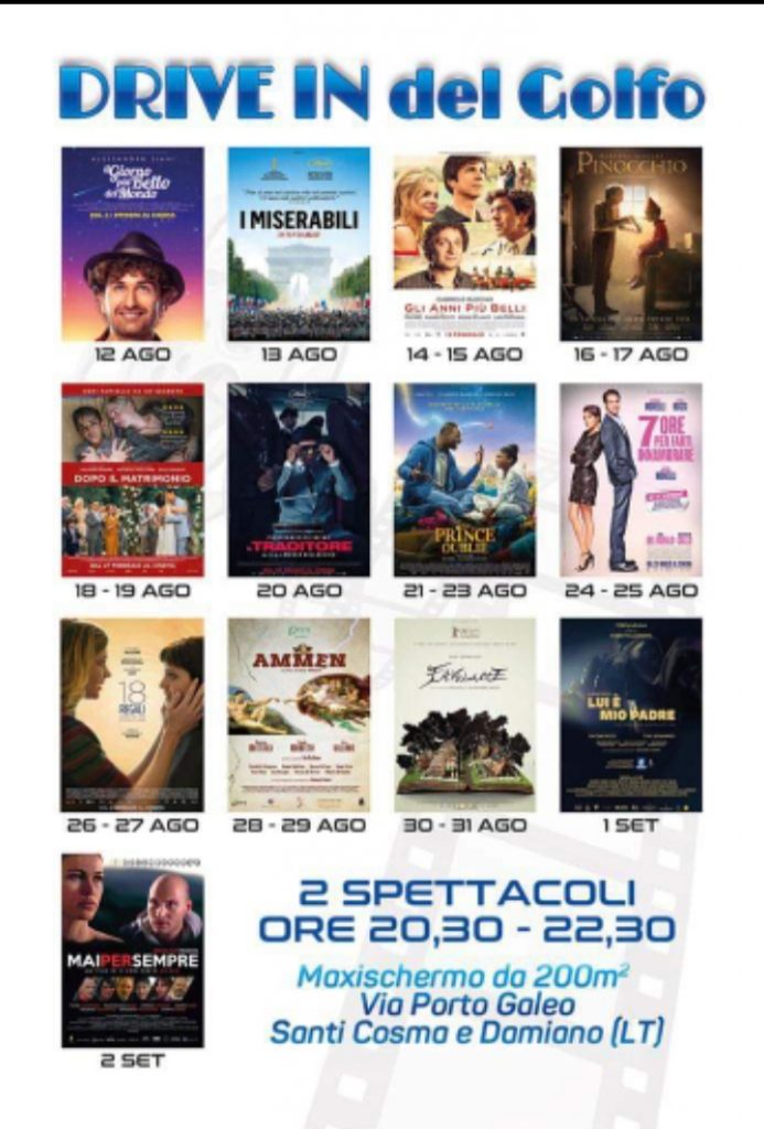 E parte con il botto l’apertura del Drive in del Golfo in Via Porto Galeo a Santi Cosma e Damiano con la proiezione del film “Il giorno più bello del mondo” di Alessandro Siani previsto per questa sera alle 20.30 e in seconda serata alle 22.30. Il costo del biglietto è di 5 euro. E’ possibile seguire lo spettacolo anche comodamente seduti sulle sedie appositamente allestite all’interno dell’area, inoltre è previsto un servizio bar presso il quale potrai acquistare pop-corn, panini, pizze, gelati e bibite.