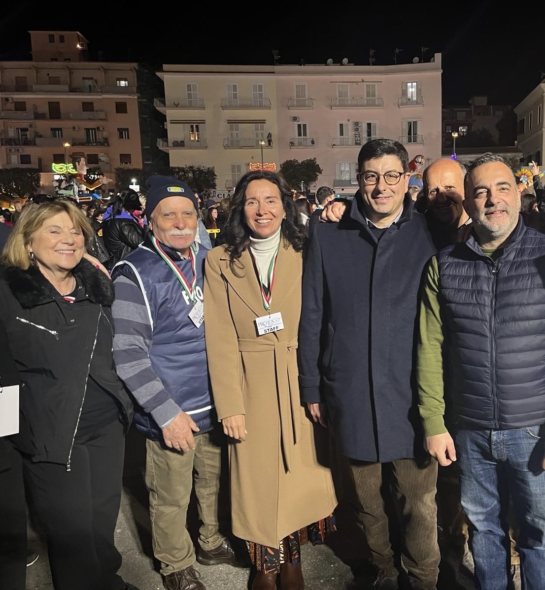 Comune di Formia e Pro Loco – La serata si è conclusa sul palco in Largo Paone, con la premiazione, la consegna di targhe a tutti i partecipanti delle scuole di danza e associazioni. Il Sindaco Gianluca Taddeo si è complimentato con tutti ed in particolare con le Forze dell’Ordine dispiegate, la Polizia Municipale, La Protezione Civile e La Croce Rossa. Un plauso alla Pro Loco Città di Formia che ha investito ingenti risorse organizzative attraverso un team efficiente e coeso. Il presidente della Pro Loco Mario Persico, insieme al consiglio direttivo, ha ringraziato tutti di aver accolto l’invito presentato per un Carnevale straordinario. Un ringraziamento ulteriore a tutti i rappresentanti dei media presenti con video-camere, telefoni e attrezzature per divulgare a 360° l’evento del martedì 13 febbraio e conclusivo del 18. (In foto, il Sindaco Gianluca Taddeo tra gli esponenti del Consiglio direttivo Pro Loco: Mario Persico presidente, Antonio Urciuolo vice presidente, Anna Sorgente segretario, Antonio Tommasino Tesoriere, Tina Mazzetti Consigliere).