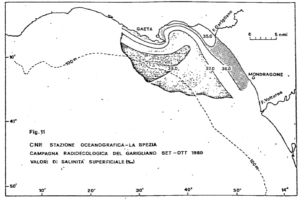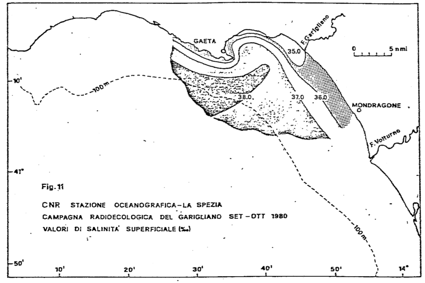 Un fazzoletto di terreno nazionale interessato dalla presenza di ben due centrali: quella del Garigliano da una parte, Borgo Sabotino dall`altro. Sulla carta due regioni diverse, la realtà sono poche centinaia di chilometri di distanza. Nel documento si ricostruisce la distribuzione di Cobalto 60 e Cesio 137. “Nell`ambiente marino considerato la radioattività ambientale artificiale direttamente correlative all`esercizio dell`impianto elettronucleare è distribuita su un`area di almeno 1700 km2. Le zone di relativa maggiore deposizione dei radionuclidi sono essenzialmente quelle dove il bilancio sedimentazione/erosione è a favore del primo fattore (golfi, batimetrie fra i 40 e i 50 metri)”.