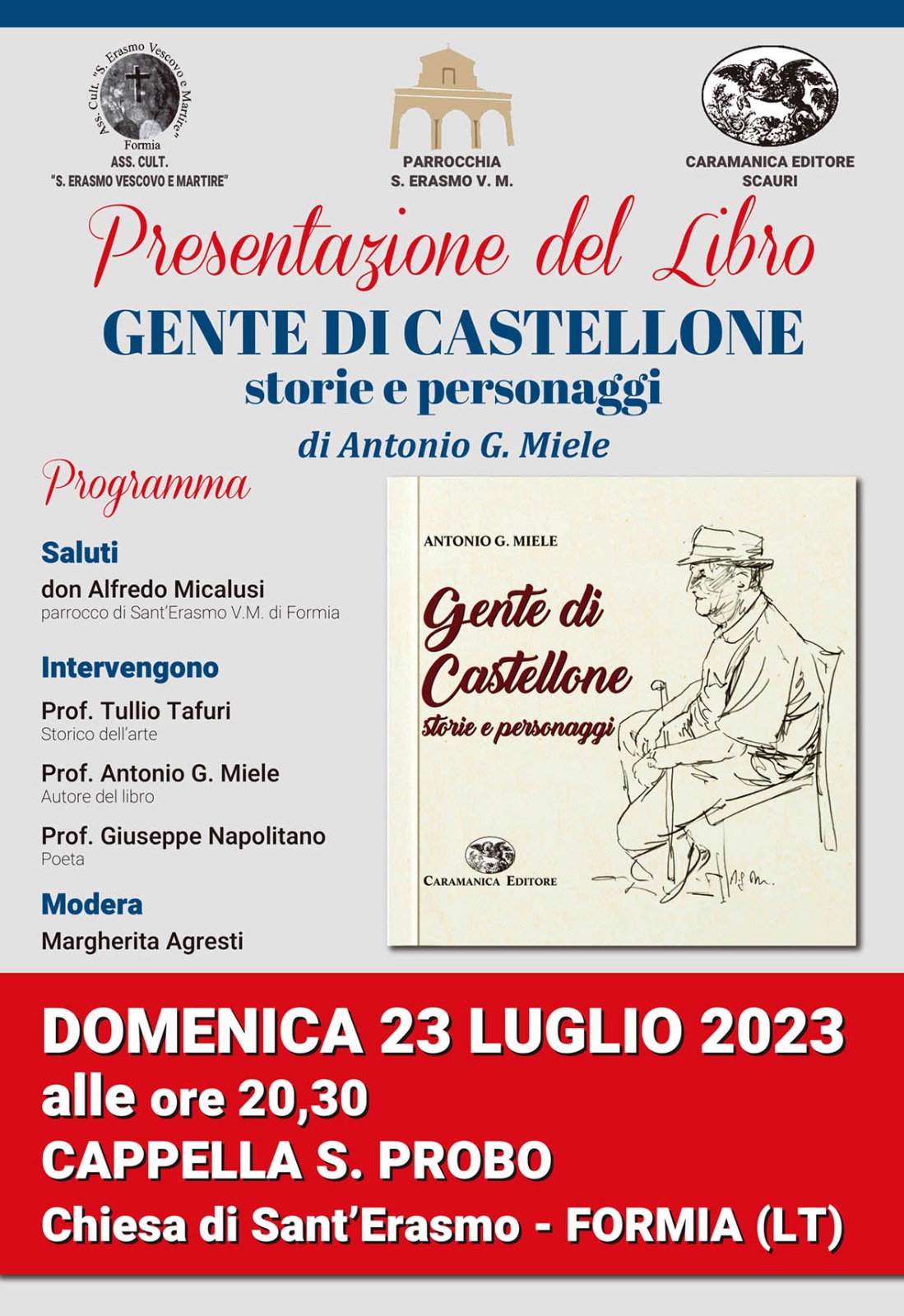 Il 23 luglio 2023 ore 20.30 presso la Cappella San Probo di Sant’Erasmo di Formia, in collaborazione con l’Associazione Culturale Sant’Erasmo di Formia, sarà presentato il libro di Antonio G. Miele Gente di Castellone – Storie e Personaggi Edito da Armando Caramanica. La presentazione sarà curata dal prof. Tullio Tafuri e dal poeta Giuseppe Napolitano. Moderatrice Margherita Agresti. Il libro raccoglie una mezza dozzina di storie di vita formiana, già pubblicate su varie riviste e periodici di Roma e del Lazio, e circa 200 tra disegni e dipinti inediti, ha già raccolto tanto interesse, approda ora come evento speciale a Castellone per proporre un’interessante riflessione sulle realtà quotidiane della gente di questo rione, in particolare, intrigante appare quel portare alla luce argomenti, che non interessano i turisti di passaggio intenti a godersi i pochi angoli caratteristici ancora rimasti di questo luogo, ma che sono eticamente dovuti nei confronti di chi, vive nella quotidianità, esigenze anche primarie che non trovano alcun interesse in chi vive al di fuori del problema, si gode la “bellezza di questi luoghi”. Il libro ha anche un aspetto socio-antropologico, si parla infatti delle tradizioni, delle superstizioni, della vita di quartiere, della scuola, delle fiabe. Non è solo un libro di racconti e memorie, ma attraverso le sue pagine, il lettore potrà vivere storie e personaggi particolari e unici che fanno la storia di Castellone. L’opera è corredata da circa 200 splendidi e interessanti bozzetti e ritratti realizzati dallo stesso Miele nel corso di oltre un decennio. Il tutto è stato composto e scritto con struggente affetto e dedicato alla Gente di Castellone, ed a sua madre, anch’ella figlia di questo quartiere. Il libro, come dice l’autore stesso nella prefazione, trova la sua ispirazione nella voglia di dare voce alla gente di Castellone. “Raccontare tutto il bello di questo luogo non è stata impresa facile, tuttavia man mano che le ricerche hanno cominciato a prendere forma scritta e disegnata, mi sono accorto di quella sintonia affettuosa con cui ancora guardo questi vicoli, queste case, queste persone. Una città, un luogo, non fanno parlare più di sé quando non hanno più memoria, non deve essere così per Castellone. I nuovi giovani parlano una lingua che nessuno capisce, i vecchi siedono solitari sulle panchine sbilenche di piazza Sant’Erasmo. Attendono un figlio, un amico, un confidente con cui raccontarsi. Negli occhi, però, non si legge rassegnazione, ma speranza. Speranza che un giorno qualcuno possa riconoscere in loro le radici di un quartiere da far nuovamente germogliare, vivere.