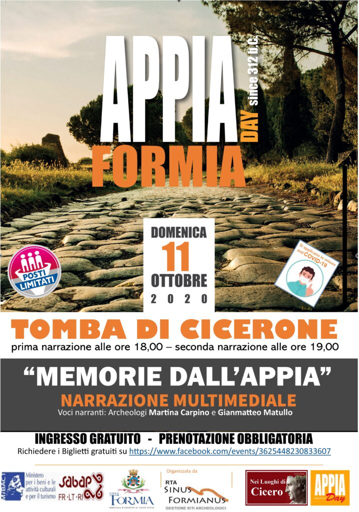 Domenica 11 ottobre 2020,alle 18 e alle 19,nel suggestivo sito archeologico della Tomba di Cicerone,RTA Sinus Formianus,in collaborazione con la Soprintendenza e la Città di Formia, propone “ Memorie dall’Appia”.