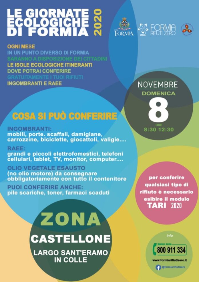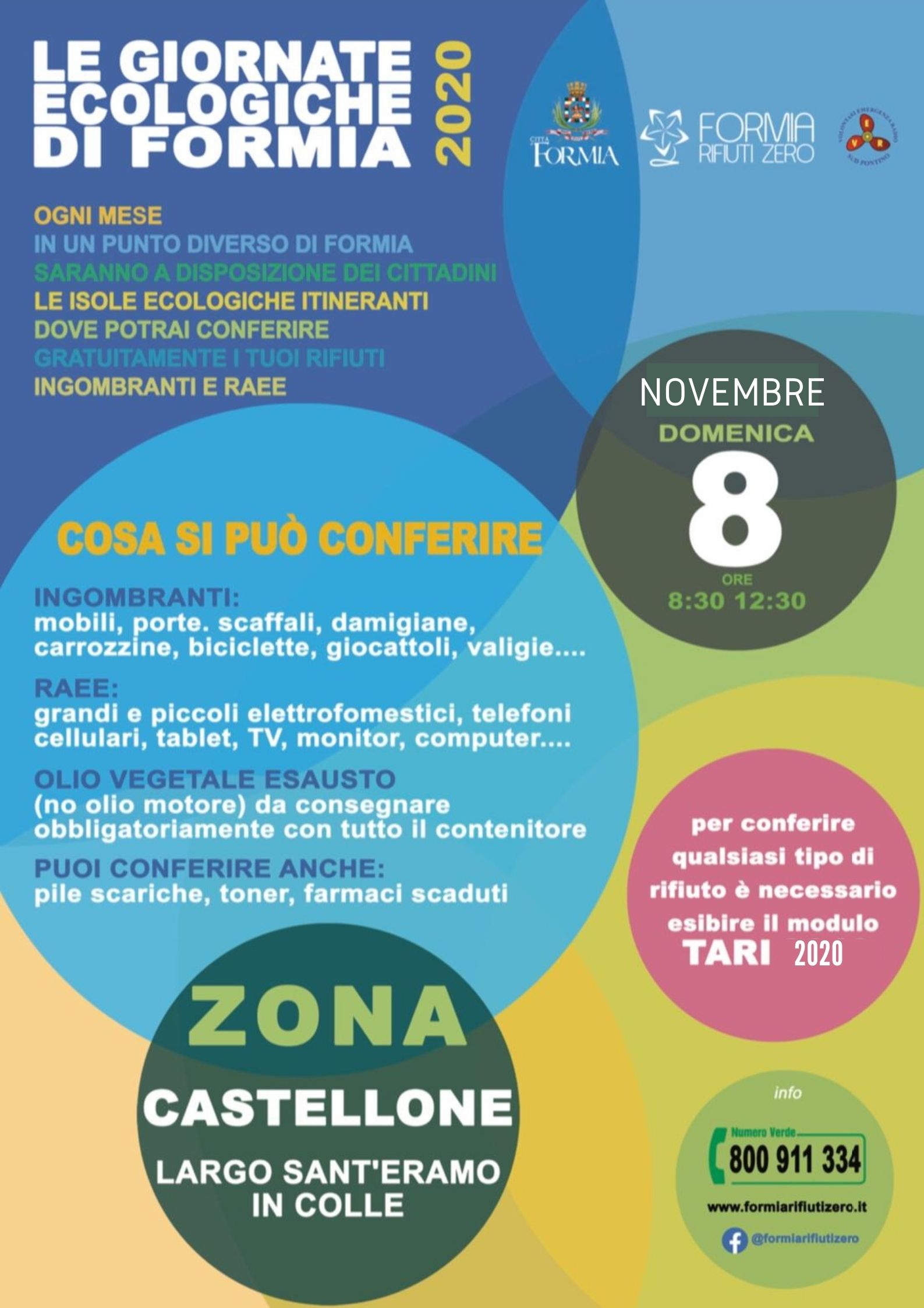 Domenica 8 novembre nuovo appuntamento con le “Giornate Ecologiche”. L’isola itinerante questa volta si sposta nel quartiere di Castellone presso Sant’Eramo in Colle, dove dalle 08:30 alle 12:30, gli operatori della Formia Rifiuti Zero, i volontari della Protezione civile Ver Sud Pontino e le associazioni “Fare Verde” e Comitato Civico “Mamurra” saranno a completa disposizione della cittadinanza per supportare nella consegna degli ingombranti e fornire informazioni sul corretto smaltimento della raccolta differenziata.