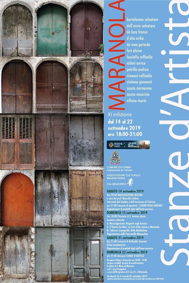 Si inaugura sabato 14 settembre alle 20.00 la Mostra d’Arte Figurativa intitolata “Stanze d’Artista”, promossa dall’associazione culturale Maranola Nostra con il patrocinio del Comune di Formia e realizzata nell’ambito della manifestazioni turistiche del “Lazio delle meraviglie”. Espongono gli artisti Salvatore Bartolomeo, Salvatore Dell’Anno, Franco De Luca, Erika D’Elia, Gerardo De Meo, Fert Alvino, Raffaella Fusciello, Enrico Milesi, Andrea Petrillo, Raffaello Simeoni, Giovanni Simione, Normanno Soscia, Maurizio Soscia, Maria Villano.