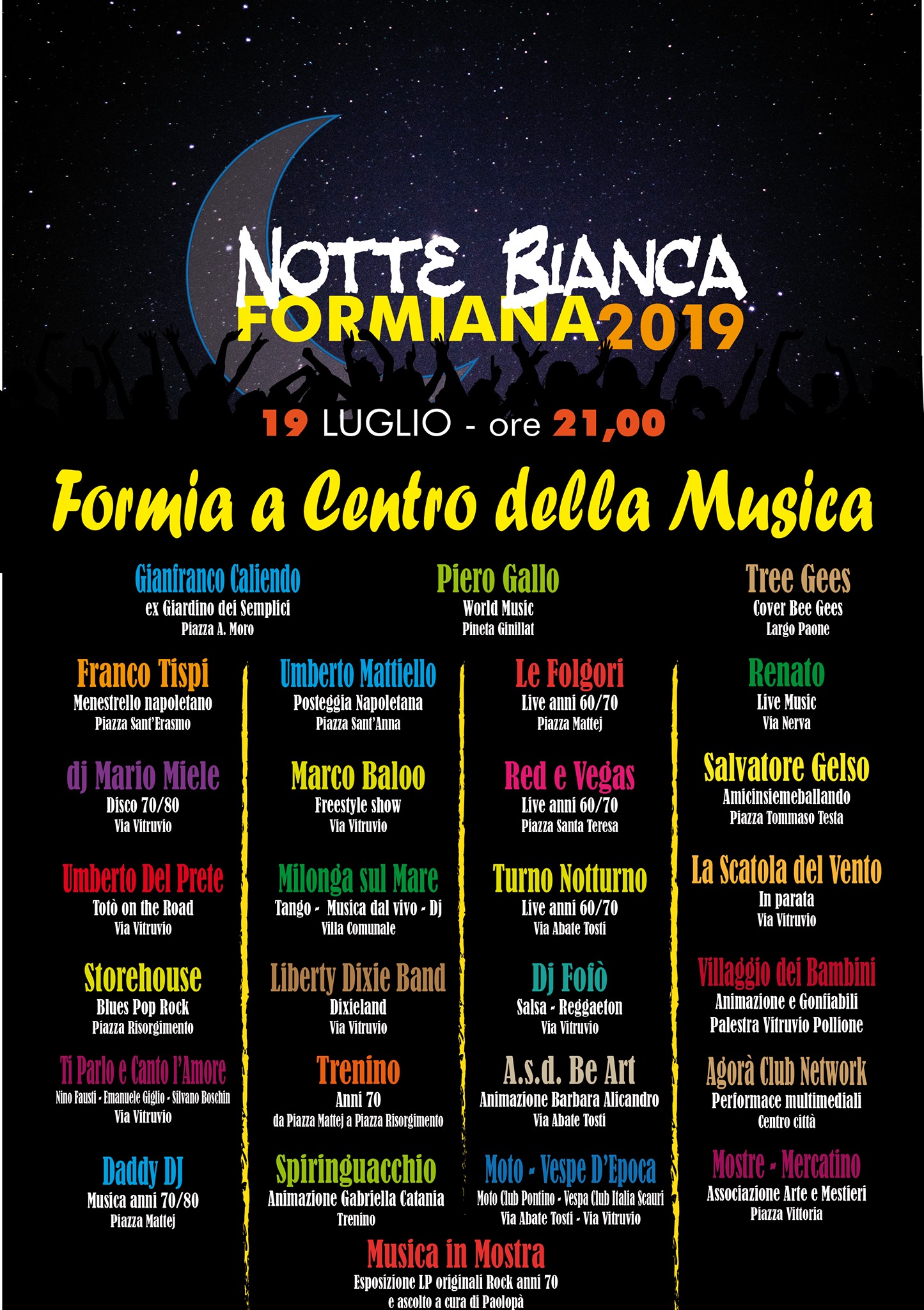 Tre appuntamenti di notevole interesse monopolizzeranno la serata di venerdì 19 luglio a Formia. Dopo le due “Notti Bianche” che hanno animato la città nelle vigilie delle feste dei patroni Sant’Erasmo e San Giovanni, domani dalle 21 la terza Notte Bianca“Formia al centro della musica”, l’evento patrocinato dal Comune di Formia e organizzato dall’associazione culturale La Magica: un lungo tour che partirà dallo storico quartiere di Castellone, attraverserà Piazza Mattej fino a Piazza Risorgimento: tre palchi conGianfranco Caliendo (Piazza Aldo Moro), Tree Gees (Largo Paone), la cover dei Bee Gees e Piero Gallo (pineta Ginillat).Tantissimi concerti dislocati nelle varie location: a Piazza Mattej si esibiranno “Le Folgori”, gruppo storico con le più belle canzoni degli anni ‘60, a Santa Teresa “Red e Vegas anni ‘70, al largo Torre di Mola musica dance anni ‘70, nella Villa comunale “Milonga sul mare”, incontro tanguero dedicato al Tango argentino: l’accoglienza sarà curata dai ragazzi dell’Happy Bar. Si proseguirà in Piazza Risorgimento con Dj Fofò e Karaoke anni ‘70, “Il villaggio dei bambini” (ingresso a biglietto) nella palestra “Pollione”, il trenino anni ‘70 che si snoderà da piazza Mattej a piazza Risorgimento, il raduno Vespe e motoamatori e lo stand con oggetti vintage anni ‘70 in via Abate Tosti, in piazza Sant’Anna con Umberto Mattiello con “La Posteggia Napoletana”, per chiudere la lunga serie di iniziative a Sant’Erasmo con Franco Tispi, il menestrello della canzone napoletana e in piazza Tommaso Testa con Francesca Curti Giardina e le melodie napoletane. Musica, balli, animazione, mercatino, mostre, un ricchissimo carnet con Formia centro d’attrazione. Sarà inoltre attivo il servizio di navette gratuito che sarà disponibile per tutti e inizierà alle 19 e sarà operativo fino al termine della manifestazione: la navetta percorrerà l’itinerario 2, dal Molo Vespucci e si fermerà lungo via Cristoforo Colombo, Piazza Mattej, Piazza Risorgimento, Via Emanuele Filiberto (San Giovanni) per poi ritornare nuovamente al Molo Vespucci.