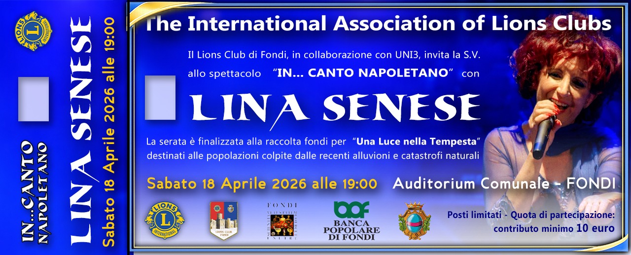 Lina Senese per i Lions di Fondi in concerto – In Belgio e la stessa Francia Lina Senese è conosciuta come la “nouvelle Piaf” con tanto di encomio dal presidente francese Macron. I Lions hanno prescelto un’artista di spessore culturale e canoro, impegnata da molti anni nel sociale, già dirigente scolastica, pluri premiata da tante associazioni tra cui Italia Nostra nell’otto marzo del 2025, per sensibilizzare tutti coloro che amano la musica finalizzata al raggiungimento di un grande obiettivo umanitario. Gli inviti con il contributo di 10 euro saranno disponibili presso la sede dell’evento a partire dalle ore 17:30. L’evento è patrocinato dal Comune di Fondi. Il Lions Club Fondi é stato istituito nell’anno associativo 1985/86. Nel 2016, il club ha celebrato il trentennale, confermando la sua attività a supporto della comunità locale, inserendosi nel contesto Lions Clubs International, ad ottimi livelli. Nel corso del 2026, il quarantennale. Melvin Jones é stato il fondatore del primo Lions Club, a Chicago nel 7 giugno del 1917. Nel 1968, il 13 giugno, fu istituita la Fondazione Lions Club International LCIF.