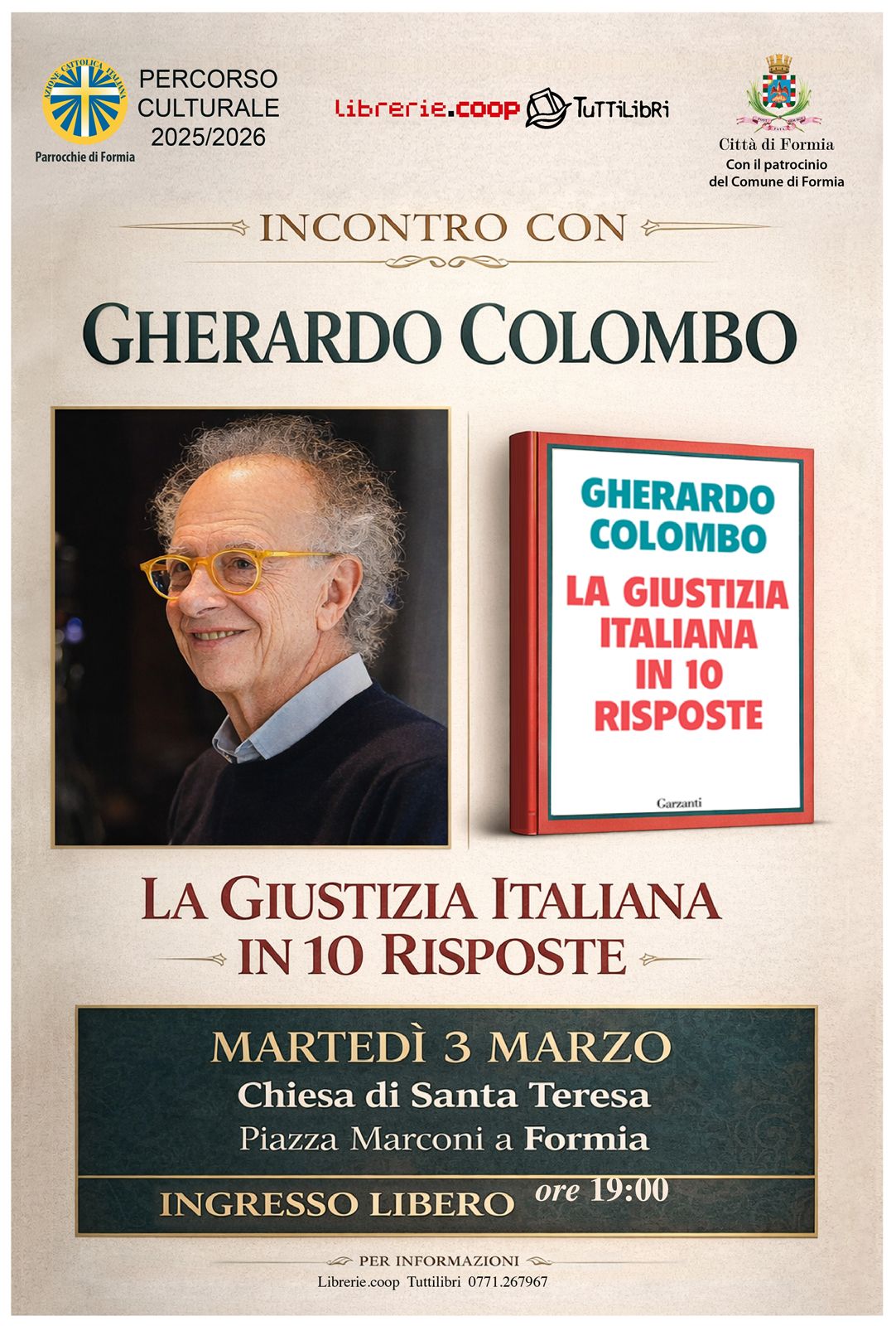 Gherardo Colombo a Formia – Martedì 3 marzo, alle ore 19:00 presso la Chiesa di Santa Teresa d’Avila in piazza Marconi a Formia, si terrà il Percorso culturale dell’Azione Cattolica, in collaborazione con la Libreria Tuttilibri e con il patrocinio del Comune di Formia. L’appuntamento rappresenta un’importante occasione di riflessione sui temi della legalità, della giustizia e della responsabilità personale e collettiva, a partire dall’esperienza e dall’impegno civile di Gherardo Colombo, già magistrato e oggi attivamente impegnato nella diffusione della cultura della Costituzione e dell’educazione alla cittadinanza, con riferimento all’ultimo libro “La giustizia italiana in 10 risposte” edito da Garzanti.