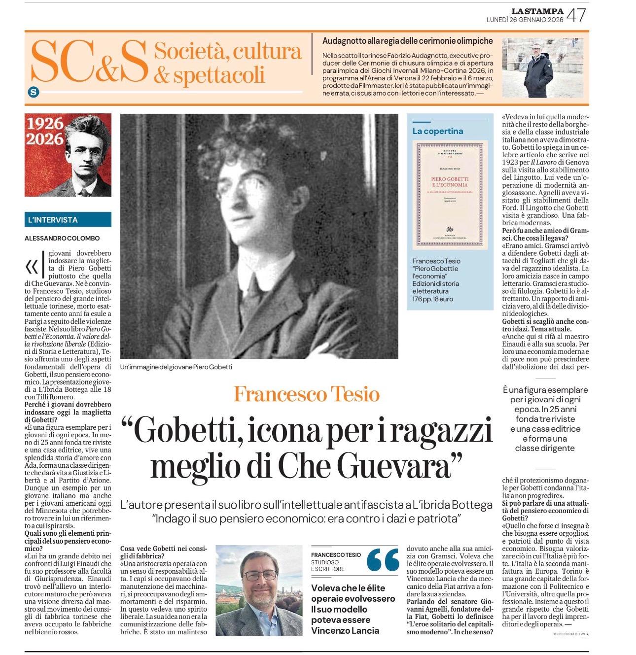 Il saggio su Piero Gobetti – Anche l’edizione torinese de La Stampa ha dedicato spazio al suo saggio, sottolineando l’originalità dell’approccio e l’importanza di riscoprire Gobetti attraverso la lente dell’economia. Sebbene non sia possibile riportare integralmente gli articoli, l’attenzione dei media torinesi conferma l’interesse crescente verso questa nuova interpretazione del pensatore piemontese. Il merito principale del lavoro di Tesio è quello di aver illuminato un aspetto meno esplorato del pensiero gobettiano: la convinzione che la rivoluzione liberale passi anche attraverso una nuova cultura economica, fondata su responsabilità individuale, spirito critico e modernizzazione del Paese. Il saggio si inserisce così nel solco delle iniziative che, negli ultimi anni, stanno contribuendo a rinnovare l’interesse per Gobetti, rendendolo accessibile a un pubblico più ampio e contemporaneo.