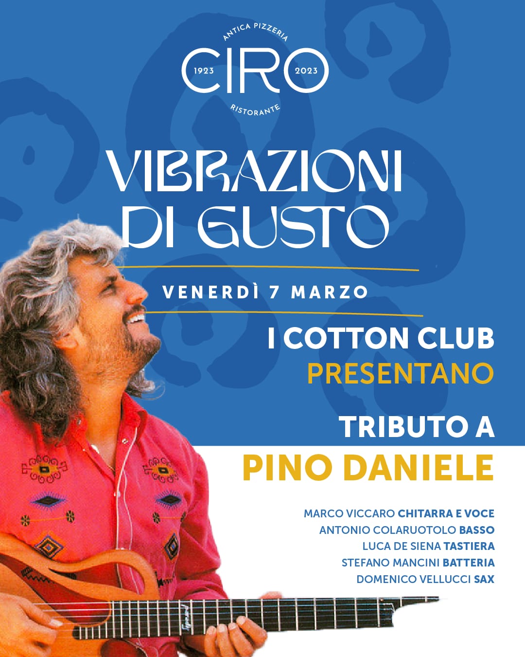 Gaeta, il 7 e l’8 Marzo Due serate musicali. Tributo a Pino Daniele e piano bar con Marco & Alfredo – Comunicazione pubblicitaria – Continuano gli appuntamenti con Vibrazioni di Gusto presso il rinomato ristorante pizzeria Ciro a Gaeta. Venerdì 7 marzo i Cotton Club andranno in scena con un tributo a Pino Daniele (chitarra e voce Marco Viccaro, basso Antonio Colaruotolo, tastiera Luca De Siena, batteria Stefano Mancini, sax Domenico Vellucci) mentre sabato 8 marzo in occasione della festa della donna si esibirà il duo Marco & Alfredo. Per contatti: 0771 465058. Di seguito le locandine dell’evento: